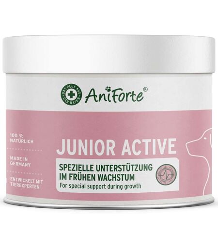 Unsere spezielle Kombination aus den im AniForte Junior Active enthaltenen Rohstoffen kann dazu beitragen die natürliche Knochenentwicklung – insbesondere von Welpen ab der 8. Woche und Junghunden im Wachstum– auf natürliche Weise zu unterstützen. Fördert die Knochenentwicklung Unterstützt die Entwicklung von Sehnen, Bänder und Knorpel Geeignet für Welpen ab der 8. Woche und junge Hunde im Wachstum Das Produkt beinhaltet eine optimale Kombination aus gemahlenen Rinderknochen, Meeresalgenkalk und Hagebutte, welche eine natürliche Knochenentwicklung sowie den Erhalt eines stabilen Skeletts und Gebisses unterstützen können. Zudem enthält das Produkt wertvolles Grünlippmuschelpulver und Kollagen – diese sind für die Unterstützung der natürlichen Entwicklung von Gelenken, Sehnen, Bändern und Knorpeln wichtig. Spirulina und Gerstengras beinhalten wichtige Vitalstoffe, wie Vitamin A. Eine Studie hat gezeigt, dass Grünlippmuschelpulver die natürliche Gelenkfunktion unterstützen kann. Ein Mangel an Vitamin A kann zu degenerativen osteoklastischen Veränderungen in den Knochen führen. Für einen rundum natürlichen und gesunden Start ins Hundeleben, empfehlen wir daher die optimale Versorgung mit den wichtigsten Vitalstoffen. Die enthaltene Spirulina-Alge liegt in Bio-Qualität vor und wurde schonend gemahlen – durch die achtsame Verarbeitung bleiben die wertvollen Naturstoffe erhalten, sodass ein hoher Vitamin A Gehalt das ernährungsbedingte Wachstum der Welpen unterstützen kann. Bereits tausende, glückliche Kunden vertrauen seit Jahren auf AniForte Junior Active. Besonders geschätzt wird die spezielle Kombination unserer hochwertigen Rohstoffe zur Unterstützung der natürlichen Knochenentwicklung. Fütterungsempfehlung: Hunde ab der 12. Woche je 5 kg: 2 g täglich (1 Dosierlöffel entspricht 2 g) Das Pulver kann einfach unter das tägliche Futter gemischt werden. Hinweis: Kühl, trocken und lichtgeschützt lagern. Lieferung inkl. praktischem Dosierlöffel. Zusammensetzung: Gerstengras Pulver, Verarbeitetes tierisches Protein gemahlen (aus frischen Rinderknochen), Hagebuttenschalen Feinteile, Meeresalgenkalk gemahlen, Grünlippmuschel Pulver, Kollagen Pulver, Spirulina Pulver* (0,0034 % Vitamin A) (*aus biologischem Anbau) Analytische Bestandteile: Rohprotein 16,54 %, Rohfett 2,53 %, Rohfaser 13,25 %, Rohasche 27,13 % ...