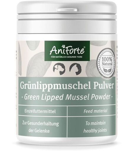Ergänzungsfuttermittel für (Hunde, Katzen und Pferde) AniForte® Grünlippmuschel Pulver Du bist auf der Suche nach einem natürlichen und wirksamen Mittel zur Unterstützung der täglich beanspruchten Gelenke und Knochen Deines Hundes oder Deiner Katze? Dann ist Grünlippmuschelpulver die ideale Wahl für Deinen Vierbeiner! AniForte® Grünlippmuschelpulver ist ein hochwertiges Ergänzungsfuttermittel für Hunde und Katzen zur täglichen Ernährung. Der hohe Gehalt an Glykosaminoglykanen trägt dazu bei, dass das nicht-entfettete Grünlippmuschelpulver für Katze und Hund in der normalen Gelenkfunktion und Agilität unterstützt. Grünlippmuschel Pulver in hochwertiger Vollfettqualität trägt zum Erhalt des Gelenkknorpels bei Hat einen positiven Einfluss auf die Gangfunktion Der hohe Gehalt an Glykosaminoglykane tragen zur Gesunderhaltung der Gelenke bei Die meisten Grünlippmuschelpulver werden als Grünlippmuschelextrakt ausgewiesen. Das klingt durchaus hochwertig, jedoch wird bei Extrakten das getrocknete Pulver entfettet. Gerade bei Grünlippmuschelpulver für Hunde und Katzen ist der hohe Fettgehalt allerdings ein Qualitätsmerkmal. Denn er gewährleistet die Versorgung mit essenziellen Omega-3 und Omega-6-Fettsäuren. Die in der Grünlippmuschel für Hunde und Katzen enthaltenen Omega-3-Fettsäuren zählen zu den essenziellen Fettsäuren. Sie sind an zahlreichen körperlichen Prozessen beteiligt und unterstützen so rund um die Agilität Deines Vierbeiners. Die enthaltenen Omega-3-Fettsäuren können nicht nur einen wichtigen Beitrag zur Unterstützung der Gelenkgesundheit leisten. Sie können sich auch positiv auf die Gesundheit von Haut und Fell auswirken. Die hauptsächlichen Bestandteile der Grünlippmuschel sind: Omega-3-Fettsäuren können das Hormonsystem wieder ins Gleichgewicht bringen und den Stoffwechsel der Zellen positiv beeinflussen Glucosamin ist ein wichtiger Bestandteil des Gelenkknorpels. Es kann helfen, den Knorpel zu schmieren und zu schützen. Chondroitin ist ein weiteres wichtiges Gelenknährstoff. Es kann dabei helfen, den Knorpel zu reparieren und zu regenerieren. Auf diese Weise wird Deine Fellnase optimal in der alltäglichen Gelenkbelastung durch die Grünlippmuschel für Hunde und Katzen unterstützt. Vorzeitigem Verschleiß kann so entgegengewirkt werden. Grünlippmuschelpulver Hund – Natürliche Nahrung für Beweglichkeit und Vitalität Studien konnten zeigen, dass eine Supplementierung mit der Grünlippmuschel Hunde und Katzen positiv in der Gangfunktion beeinflussen kann. Es kann die Regeneration des Gelenkknorpels unterstützen und sich dadurch vorteilhaft auf die Gelenkqualität der Tiere auswirken. Der Erhalt der Gelenkfunktion und der Beweglichkeit ist vor allem bei älteren Hunden sowie großen Hunderassen ein wichtiges Thema. Grünlippmuschel für Hund und Katze – Beste Qualität aus Neuseeland Unser Grünlippmuschelpulver für Hunde und Katzen stammt von einer lizensierten Marinefarm aus Neuseeland. Dort wird das Fleisch der Grünlippmuscheln durch schonende... ...
