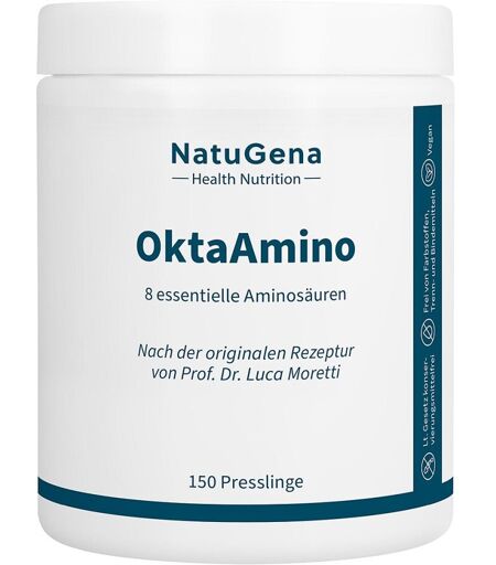 Anwendungsgebiet von NatuGena OktaAmino PresslingeNatuGena OktaAmino Presslinge von NatuGena enthält die acht Aminosäuren, die der menschliche Körper nicht selbst bilden kann: L-Leucin, L-Isoleucin, L-Valin, L-Lysin, L-Threonin, L-Phenylalanin, L-Methionin und L-Tryptophan. Diese müssen über die Ernährung aufgenommen werden. Drei dieser Aminosäuren – L-Leucin, L-Isoleucin und L-Valin – gehören zur Gruppe der verzweigtkettigen Aminosäuren, die am körpereigenen Eiweißstoffwechsel beteiligt sind.Wirkstoffe / Inhaltsstoffe / ZutatenZutaten von NatuGena OktaAmino Presslinge:L-Leucin (19,6 %), L-Valin (16,6 %), L-Isoleucin (14,8 %), L-Lysin (14,3 %), L-Phenylalanin (12,9 %), L-Threonin (11,1 %), L-Methionin (7,0 %), L-Tryptophan (3,7 %).Inhaltsstoffepro Pressling5 Presslinge10 PresslingeEAA*1 000 mg5 000 mg10 000 mgBCAA**510,4 mg2 552 mg5 104 mgL-Leucin196,4 mg982 mg1 964 mgL-Valin165,7 mg828,5 mg1 657 mgL-Isoleucin148,3 mg741,5 mg1 483 mgL-Lysin142,9 mg714,5 mg1 429 mgL-Phenylalanin128,9 mg644,5 mg1 289 mgL-Threonin111,1 mg555,5 mg1 111 mgL-Methionin69,9 mg349,5 mg699 mgL-Tryptophan36,8 mg184 mg368 mg*EAA (Essential Amino Acids): vom Körper nicht selbst hergestellte Aminosäuren.**BCAA (Branched Chain Amino Acids): verzweigtkettige Aminosäuren (L-Leucin, L-Valin, L-Isoleucin).GegenanzeigenBei bekannter Überempfindlichkeit gegenüber einen der oben genannten Inhaltsstoffe sollte dieses Produkt nicht angewendet werden.DosierungVerzehrempfehlung von NatuGena OktaAmino Presslinge:1- bis 2-mal täglich 5 Presslinge. Optimal ist der Verzehr mindestens 30 Minuten vor oder 90 Minuten nach einer Mahlzeit mit 250 ml stillem, lauwarmem Wasser/Tee oder wahlweise mit einer halben frisch gepressten Zitrone.HinweiseNahrungsergänzungsmittel sollten nicht als Ersatz für eine ausgewogene und abwechslungsreiche Ernährung sowie für eine gesunde Lebensweise verwendet werden. Außerhalb der Reichweite von kleinen Kindern aufbewahren. Verschlossen, kühl, trocken und lich ...