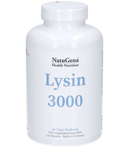 Nahrungsergänzungsmittel sind kein Ersatz für eine ausgewogene und abwechslungsreiche Ernährung und eine gesunde Lebensweise. NatuGena Lysin 3000 NatuGena Lysin 3000 enthält 3000 mg L-Lysin pro Tagesdosis und ist ideal zur Ergänzung der Ernährung bei erhöhtem Bedarf an der essentiellen Aminosäure. Die vegane Formel ist frei von Farb-, Konservierungs-, Gluten-, Laktose- sowie Trenn- und Bindemitteln. Zutaten: L-Lysin-Hydrochlorid, Kapselhülle: Hydroxypropylmethylcellulose (HPMC) Nährwertangaben: Nährwertangaben Nährwert Menge Pro L-Lysin 500 mg pro Kapsel L-Lysin 3000 mg pro Tagesdosis (6 Kapseln) Verzehrempfehlung: 1-mal täglich 6 Kapseln oder morgens und mittags je 3 Kapseln. Optimal 30 bis 90 Minuten nach einer Mahlzeit mit 250 ml stillem, lauwarmem Wasser oder mit frisch gepresster Zitrone einnehmen. Hinweise & Aufbewahrung: Nahrungsergänzungsmittel sollten nicht als Ersatz für eine abwechslungsreiche Ernährung und eine gesunde Lebensweise verwendet werden. Außerhalb der Reichweite von kleinen Kindern aufbewahren. Kühl, trocken und lichtgeschützt lagern. Die angegebene tägliche Verzehrmenge darf nicht überschritten werden. Nettofüllmenge: 240 Kapseln = 180 g Hersteller: NatuGena GmbH Münchener Str. 149 85051 Ingolstadt ...