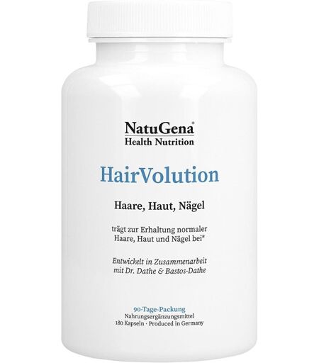 Anwendungsgebiet von NatuGena HairVolution KapselnNatuGena HairVolution Kapseln enthalten eine Kombination aus Vitaminen, Spurenelementen, Kollagenpeptiden und pflanzlichen Bestandteilen. Biotin, Zink und Selen tragen zur Erhaltung normaler Haare bei, Kupfer unterstützt die normale Haarpigmentierung bei. Weitere enthaltene Nährstoffe wie Vitamin C, ausgewählte B-Vitamine und pflanzliche Extrakte ergänzen die Zusammensetzung.Wirkstoffe / Inhaltsstoffe / ZutatenZutaten von NatuGena HairVolution Kapseln:Kapselhülle: Hydroxypropylmethylcellulose (HPMC) Acerola-Extrakt, Bambus-Extrakt (15:1), Bockshornkleesamen-Extrakt (4:1), Peptan® B 2000 LD, Aprikosenkernpulver, Acai-Beeren-Extrakt (4:1), Ackerschachtelhalm-Extrakt, Coenzym Q10, Kürbiskern-Extrakt (10:1), Zinkcitrat, Beta-Carotin, Nicotinamid, Calcium-D-Panthothenat, Natriumselenit, Riboflavin-5-Phosphat, Thiaminhydrochlorid, Pyridoxal-5-Phosphat, Kupferbisglycinat, Methyltetrahydrofolat, D-Biotin, Methylcobalamin.Inhaltsstoffepro Tagesdosis (2 Kapseln)NRV¹Acai-Beeren-Extrakt (4:1)50 mgAcerola-Extrakt240 mg– davon Vitamin C60 mg75Ackerschachtelhalm-Extrakt50 mgAprikosenkern-Pulver52 mgBeta-Carotin (Vitamin A)1,2 mg150Bockshornkleesamen-Extrakt (4:1)150 mgCoenzym Q1050 mgKollagen (Peptan ® B 2000 LD)100 mgKupfer0,5 mg50Kürbiskern-Extrakt (10:1)50 mgSelen40 μg73Silicium53,5 mgZink8 mg80Vitamin B1 (Thiamin)3,5 mg318Vitamin B2 (R5P bioaktiv)3 mg214Vitamin B3 (Nicotinamid bioaktiv)12 mg74Vitamin B5 (Pantothensäure)10 mg166Vitamin B6 (P5P bioaktiv)2,3 mg164Vitamin B7 (D-Biotin bioaktiv)800 μg1 600Vitamin B9 Folsäure (5-MTHF bioaktiv)35 μg18Vitamin B12 (Methylcobalamin bioaktiv)10 μg400Inhaltsstoffepro KapselNRV¹Acai-Beeren-Extrakt (4:1)25 mgAcerola-Extrakt120 mg– davon Vitamin C30 mg32,5Ackerschachtelhalm-Extrakt25 mgAprikosenkern-Pulver26 mgBeta-Carotin (Vitamin A)0,6 mg75Bockshornkleesamen-Extrakt (4:1)75 mgCoenzym Q1025 mgKollagen (Peptan ® B 2000 LD)50 mgKupfer0,25 mg25Kürbiskern-Extrakt (1 ...
