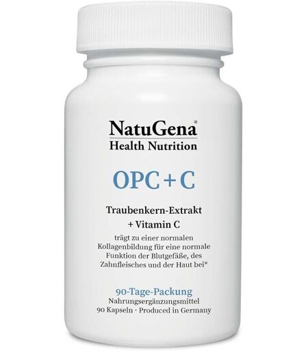 Nahrungsergänzungsmittel sind kein Ersatz für eine ausgewogene und abwechslungsreiche Ernährung und eine gesunde Lebensweise. NatuGena® OPC+C Kapseln OPC+C besteht aus französischem Traubenkern-Extrakt kombiniert mit dem Co-Faktor Vitamin C aus natürlicher Hagebutte. Das enthaltene OPC und Vitamin C zeichnen sich besonders durch ihre hohe Wirksamkeit bei der Kollagenbildung in Blutgefäßen, Zahnfleisch, Haut, Knochen, Knorpeln und Zähnen aus. Besteht aus französischem Traubenkern-Extrakt kombiniert mit dem Co-Faktor Vitamin C aus natürlicher Hagebutte Das enthaltene OPC und Vitamin C zeichnen sich besonders durch ihre hohe Wirksamkeit bei der Kollagenbildung in Blutgefäßen, Zahnfleisch, Haut, Knochen, Knorpeln und Zähnen aus Höchste Rohstoffqualität aus deutscher Herstellung Produkt für Longevity und better-aging Zutaten: Traubenkern-Extrakt, Kapselhülle: Hydroxypropylmethylcellulose (HPMC), Hagebutten-Extrakt. Nährwertangaben Inhaltsstoff Pro Tagesdosis *NRV Traubenkern-Extrakt 625 mg - – davon 60% OPC 250 mg - Hagebutten-Extrakt 100 mg - – davon Vitamin C 50 mg 62,5% 1 Referenzmengen für den durchschnittlichen Erwachsenen nach VO (EU) 1169/2011 (%). Der Gehalt an OPC wurde verringert, da wir die Rückmeldung bekamen, dass es pro Kapsel zu stark wirkt (vorher 526mg Traubenkern-Extrakt zu 316mg OPC, danach auf 426mg zu 250mg OPC, jetzt ist das Extrakt noch natürlicher mit 625mg zu 250mg.) Verzehrempfehlung: 1-mal täglich 1 Kapsel. Optimal ist der Verzehr mindestens 30 Minuten voreiner Mahlzeit mit 250 ml stillem, lauwarmem Wasser oder wahlweise mit einer halben frisch gepressten Zitrone. Hinweis: In der Schwangerschaft und Stillzeit ist die Einnahme nur unter ärztlicher Aufsicht empfohlen. Nahrungsergänzungsmittel sollten nicht als Ersatz für eine ausgewogene und abwechslungsreiche Ernährung sowie für eine gesunde Lebensweise verwendet werden. Die angegebene empfohlene tägliche Verzehrmenge darf nicht überschritten werden. Aufbewahrung: Außerhalb der Reichweite von kleinen Kindern aufbewahren. Verschlossen, kühl, trocken und lichtgeschützt lagern. Nettofüllmenge: 60 Kapseln ℮ 76,05 g Herstellerdaten: NatuGena GmbH Münchner Str. 149 85051 Ingolstadt Deutschland ...