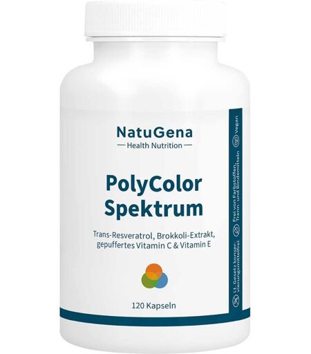 Anwendungsgebiet von NatuGena Polycolor Spektrum KapselnDie Zusammensetzung von NatuGena Polycolor Spektrum Kapseln basiert auf ausgewählten Pflanzenextrakten und den Vitaminen C und E in einer sorgfältig abgestimmten Kombination.Der verwendete Brokkoli-Extrakt enthält Sulforaphan, einen schwefelhaltigen sekundären Pflanzenstoff aus der Gruppe der Senfölglykoside, der typischerweise in Kreuzblütlern vorkommt. Grüntee-Extrakt liefert natürlich vorkommende Polyphenole, darunter Epigallocatechingallat (EGCG), das vor allem in jungen Teeblättern enthalten ist. Der Granatapfel-Extrakt enthält Ellagsäure, eine pflanzliche Verbindung, die hauptsächlich in der Fruchtschale vorkommt.Ergänzt wird die Formulierung durch Quercetin, trans-Resveratrol aus dem Markenrohstoff Veri-te™, Beta-Carotin aus pflanzlicher Quelle, Lycopin aus Tomate sowie Ingwer-Extrakt mit einem festgelegten Gehalt an Gingerolen.Abgerundet wird die Rezeptur durch die Vitamine C und E. Vitamin C liegt in gepufferter Form vor, was zu einer guten Verträglichkeit beitragen kann. Beide Vitamine tragen dazu bei, die Zellen vor oxidativem Stress zu schützen. Darüber hinaus unterstützt Vitamin C den normalen Energiestoffwechsel und die normale Funktion des Immunsystems.Wirkstoffe / Inhaltsstoffe / ZutatenNatuGena Polycolor Spektrum Kapseln enthält:L-Ascorbinsäure, Calciumascorbat, DL-Alpha-Tocopherylacetat, Kapselhülle: Hydroxypropylmethylcellulose (HPMC) Brokkoli-Extrakt, Grüner-Tee-Extrakt, Japanischer-Schnurbaum-Extrakt, Granatapfel-Extrakt, Trans-Resveratrol (Veri-teTM 98 %), Ingwer-Extrakt, Tomaten-Extrakt, Beta-Carotin.GegenanzeigenBei bekannter Überempfindlichkeit gegenüber einem der oben genannten Inhaltsstoffe sollte dieses Produkt nicht angewendet werden.DosierungAnwendungsempfehlung von NatuGena Polycolor Spektrum Kapseln:1-mal täglich 2 Kapseln. Optimal ist der Verzehr zu einer Mahlzeit mit 250 ml stillem, lauwarmem Wasser oder wahlweise mit einem Teelöffel Omega-3-Öl zur ...