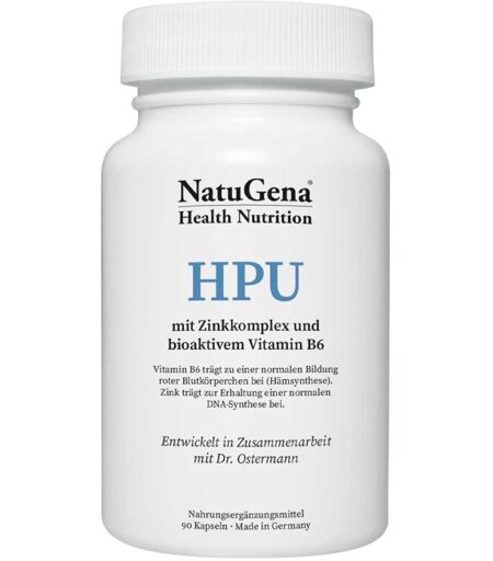 Anwendungsgebiet von NatuGena HPU KapselnHämopyrrollaktamurie, auch bekannt als HPU oder KPU, ist eine Stoffwechselstörung, bei der die Häm-Synthese gestört ist. Betroffene leiden häufig unter einem erhöhten Verlust von Mikronährstoffen, der durch die normale Nahrungsaufnahme nicht ausreichend kompensiert werden kann. Dadurch mangelt es dem Körper unter anderem an wichtigen Vitaminen wie B1, B6 und Folsäure sowie an essenziellen Mineralstoffen wie Selen, Magnesium, Mangan und Zink.Wirkstoffe / Inhaltsstoffe / ZutatenZutaten von NatuGena HPU Kapseln:Camu-Camu-Extrakt (Vitamin C), Vitamin B6 (P5P), Pantothensäure, Vitamin B1, Vitamin B2 (R5P), Folsäure (MHTHF), D-Biotin, Vitamin B12 (Methylcobalamin), Vitamin B12 (Hydroxycobalamin), Myo-Inositol, Zinkpicolinat, Zinkbisglycinat, Zinkgluconat, Manganbisglycinat, Mangangluconat, Cholinbitartrat, Selenmethionin, Natriumselenit, Chrompicolinat, Magnesiumbisglyciant, Magnesiummalat, Magnesiumtauratt, L-Cystin, Vitamin B12 (Adenosylcobalamin).Inhaltsstoffe pro Tagesdosis (3 Kapseln) NRV*Camu-Camu-Extrakt 222 mg -davon Vitamin C 100 mg 125 %Cholin 10 mg - Chrom 100 μg 250 %L-Cystein 300 mg -Magnesium 100 mg 27 %davon Magnesiumbisglycinat 33,3 mg 9 %davon Magnesiummalat 33,3 mg 9 %davon Magnesiumtaurat 33,3 mg 9 %Mangan 3 mg 150 %davon Manganbisglycinat 1,5 mg 75 %davon Mangangluconat 1,5 mg 75 %Myoinositol 20 mg -Selen 100 μg 180 %davon Selenmethionin 50 μg 90 %davon Natriumselenit 50 μg 90 %Vitamin B1 (Thiamin) 15 mg 730 %Vitamin B2 (R5P bioaktiv) 15 mg 430 %Vitamin B3 (Nicotinamid bioaktiv) 20 mg 124 %Vitamin B5 (Pantothensäure) 10 mg 63 %Vitamin B6 (P5P bioaktiv) 25 mg 1785 %Vitamin B7 (D-Biotin bioaktiv) 40 μg 83 %Vitamin B9 Folsäure (MTHF bioaktiv) 150 μg 75 %Vitamin B12 (bioaktiv) 150 μg 3000 %davon Methylcobalamin 50 μg 1000 %davon Hydroxycobalamin 50 μg 1000 %davon Adenosylcobalamin 50 μg 1000 %Zink 30 mg 300 %davon Zinkpicolinat 10 ...