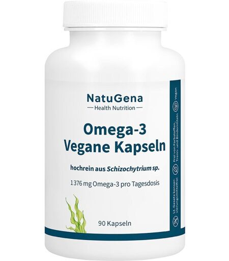 Anwendungsgebiet von NatuGena® Omega-3 vegane Kapseln NatuGena® Omega-3 vegane Kapseln : Die pfanzliche Idealquelle für Omega-3 Unsere hochdosierten veganen Omega-3-Kapseln bieten eine herausragende Möglichkeit, Ihre Omega-3-Fettsäuren auf pflanzliche Weise zu ergänzen. Jede Tagesdosis enthält 1.376 mg natürliche Omega-3-Fettsäuren. Unsere Algenkapseln sind reich an den essenziellen DHA- und EPA-Fettsäuren und somit die ideale vegane Omega-3-Quelle für all jene, die tierische Produkte meiden möchten. Rein pfanzliche Algenkapseln – 100 % Vegan Unsere Omega-3 Vegane Kapseln basieren ausschließlich auf pflanzlichen Inhaltsstoffen. Wir verwenden die Meeresmikroalge Schizochytrium sp. als Grundlage für unser Omega-3-reiches Algenöl. Diese besondere Algenart zeichnet sich durch ihren hohen Gehalt an marinen Omega-3-Fettsäuren DHA und EPA aus. Nachhaltigkeit im Fokus Die Herstellung unserer Omega-3 Vegan Algenöl-Kapseln erfolgt streng nach Nachhaltigkeitsrichtlinien. Wir verwenden kultivierte Mikroalgen in speziellem Meerwasser, um wertvolle Ressourcen zu schonen und die natürliche Nahrungsgrundlage der Fische zu bewahren. So bleibt das marine Ökosystem intakt und die Fischpopulationen werden geschont. Besonderheit und Herkunft der Schizochytrium sp. Mikroalge Unsere Omega-3 Vegan Algenöl-Kapseln basieren auf der einzigartigen Mikroalge Schizochytrium sp. Diese winzigen, einzelligen Algen gedeihen in Mangrovenwäldern an tropischen Küsten und ernähren sich von natürlichen pflanzlichen Stoffen. Die herausragende Eigenschaft dieser Alge ist die Produktion der essentiellen marinen Omega-3-Fettsäuren DHA und EPA. Unsere veganen Omega-3-Kapseln verkörpern eine revolutionäre Verbindung aus Natur und Wissenschaft, basierend auf der nachhaltigen Kultivierung von Algen. Durch den Einsatz von innovativen Bio-Fermentern aus hochwertigem, rostfreiem Edelstahl wird eine Algenzucht unter Ausschluss von Licht ermöglicht. Dank des ...