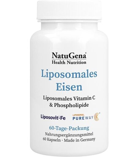 Anwendungsgebiet von Liposomales Eisen + Vitamin C Kapseln VeganLiposomales Eisen von NatuGena vereint innovative Technologie mit hochwertigen Markenrohstoffen, um die Aufnahme und Verträglichkeit von Eisen zu optimieren. Die Rezeptur kombiniert LIPOSOVIT®-Fe, PureWay-C® und LeciFis EXP, eine speziell abgestimmte Zusammensetzung mit hoher Bioverfügbarkeit. LIPOSOVIT®-Fe ist eine liposomale Form von Eisenbisglycinat. Die schützende Hülle verbessert die Aufnahme, reduziert unerwünschte Magen-Darm-Belastungen und sorgt für eine effiziente Verwertung. Eine spezielle Trocknungsmethode sichert die Stabilität des Eisens – ganz ohne Konservierungsstoffe oder Kühlung. Eisen trägt zu einer normalen Funktion des Immunsystems, zur normalen Bildung von roten Blutkörperchen und Hämoglobin sowie zur Verringerung von Müdigkeit und Ermüdung bei. PureWay-C® ergänzt die Formulierung als patentierte Form von Vitamin C. Vitamin C erhöht die Eisenaufnahme und trägt zu einer normalen Funktion des Immunsystems bei. Der enthaltene Phospholipid-Komplex LeciFis EXP trägt zur Stabilisierung der Liposomen bei und verbessert die Verfügbarkeit der Nährstoffe. Die Kombination dieser Technologien ermöglicht eine gezielte und gut verträgliche Eisenaufnahme.Wirkstoffe / Inhaltsstoffe / ZutatenLiposomales Eisen + Vitamin C Kapseln Vegan enthält:Zutaten: Liposomales Eisenbisglycinat (LIPOSOVIT®- Fe), Vitamin C (PureWay-C®), Kapselhülle: Hydroxypropylmethylcellulose (HPMC), Phospholipid-Komplex-Pulver (LeciFis EXP) (Soja).Inhaltsstoffepro Tagesdosis (1 Kapsel)NRV¹LIPOSOVIT®-Fe²420 mg– davon Eisen21 mg150PureWay-C®³171 mg-– davon Vitamin C120 mg150– davon Citrus-Bioflavonoid8 mgLeciFis EXP Lecithin100 mg– davon Phosphatidylcholin20 mg– davon Phosphatidylinositol16 mg– davon Phosphatidylethanolamin12 mg– davon Phosphatsäure7 mg¹Referenzmenge für den durchschnittlichen Erwachsenen nach VO (EU) 1169/2011 (%).²LIPOSOVIT®-Fe ist eine eingetragene Marke vo ...