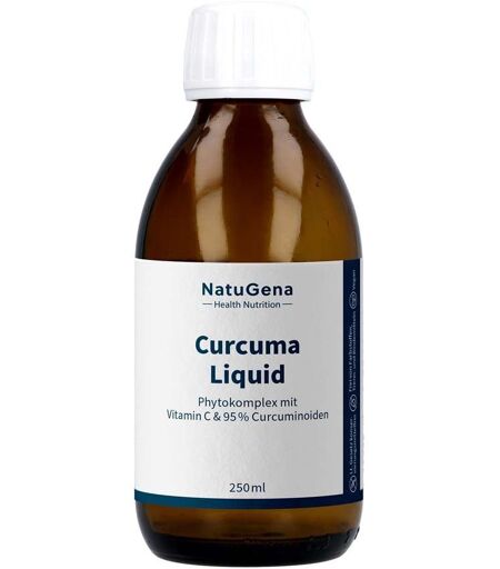 Nahrungsergänzungsmittel sind kein Ersatz für eine ausgewogene und abwechslungsreiche Ernährung und eine gesunde Lebensweise. NatuGena Curcuma Liquid – Flüssiges Curcuma-Konzentrat mit Curcuminoiden und Vitamin C NatuGena Curcuma Liquid enthält ein hochkonzentriertes Curcuma-Extrakt im Verhältnis 35:1 mit 515 mg Curcuminoiden pro Tagesportion. Die flüssige Formulierung ermöglicht eine flexible Dosierung und eine gute Bioverfügbarkeit im Vergleich zu herkömmlichem Kurkuma Pulver. Ein abgestimmter Phytokomplex aus Apfel, Maracuja und Ingwer sorgt für eine ausgewogene Geschmackskomposition. Akazienfasern tragen zur Textur bei und liefern natürliche Ballaststoffe. Ergänzt wird die Rezeptur durch gepuffertes Vitamin C, das zur normalen Funktion des Immunsystems und zum Schutz der Zellen vor oxidativem Stress beiträgt. Das enthaltene Vitamin C liegt in gepufferter Form vor und ist dadurch gut verträglich. Dank des beiliegenden Messbechers lässt sich NatuGena Curcuma Liquid flexibel und individuell dosieren – ideal für den täglichen Einsatz ohne Kapseln. Zutaten: BIO-Apfelsaftkonzentrat (30 %), Wasser, Maracujapüree, Ingwersaft, BIO-Glycerin (10 %, palmölfrei), Curcuma-Extrakt (35:1), Akazienfasern, Magnesiumascorbat, Aroma: Passionsfrucht, Antioxidationsmittel: Rosmarin-Extrakt. DE-ÖKO-006 Nährwerte Nährstoff Menge pro Portion (8 ml) % NRV* Curcuma-Extrakt (35:1) 545 mg – – davon Curcuminoide 515 mg – – davon Curcumin 300 mg – Akazienfasern 200 mg – Vitamin C (gepuffert) 80 mg 100 % Phytokomplex (Apfel, Maracuja, Ingwer) 6.200 mg – *Referenzmengen für den durchschnittlichen Erwachsenen nach VO (EU) 1169/2011 Verzehrempfehlung: 1-mal täglich 8 ml. Der Messbecher liegt bei. Optimal ist der Verzehr zu einer fettreichen Mahlzeit. Aufbewahrung: Außerhalb der Reichweite von kleinen Kindern aufbewahren. Trocken, bei einer Temperatur unter 25 °C, vor Licht geschützt und gut verschlossen lagern. Hinweis: Nahrungsergänzungsmittel sollten nicht als Ersatz für eine ausgewogene und abwechslungsreiche Ernährung und für eine gesunde Lebensweise verwendet werden. Außerhalb der Reichweite von kleinen Kindern aufbewahren. Verschlossen, kühl, trocken und lichtgeschützt lagern. Die angegebene empfohlene tägliche Verzehrmenge darf nicht überschritten werden. Nettofüllmenge: 250 ml Hersteller: NatuGena GmbH Münchener Str. 149 85051 Ingolstadt ...