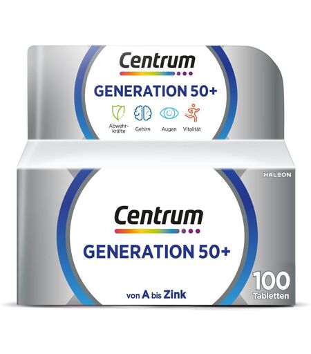 Nahrungsergänzungsmittel sind kein Ersatz für eine ausgewogene und abwechslungsreiche Ernährung und eine gesunde Lebensweise.Die Nährstoff-Formel Generation 50+ ist speziell für die Bedürfnisse von Best Agern ab 50 formuliert und ergänzt die Ernährung sinnvoll mit Vitaminen, Mineralstoffen und Spurenelementen. Die hochwertige Komplettversorgung Generation 50+ versorgt Sie mit lebensnotwendigen Vitaminen, Mineralstoffen und Spurenelementen Die Formulierung ist speziell für die Bedürfnisse von Best Agern ab 50 entwickelt Die Centrum Verpackungen werden derzeit sukzessive auf ein neues Design umgestellt; während der Umstellungszeit sind beide Versionen im Umlauf. Die Tablettenfarbe ist etwas dunkler als zuvor. glutenfrei, laktosefrei Der menschliche Körper ist ein biologisches Meisterwerk in dem hochkomplexe Prozesse ablaufen für die Mikronährstoffe in ausreichender Menge benötigt werden. Die Centrum Nährstoff-Formel Generation 50+ enthält alle lebensnotwendigen Vitamine sowie wichtige Mineralstoffe und Spurenelemente. Die Formulierung ist speziell auf die Bedürfnisse von Best Agern abgestimmt - zur optimalen Ergänzung Ihrer täglichen Ernährung. Mit nur einer Tablette pro Tag decken Sie den Tagesbedarf vieler Vitamine, Mineralstoffe ; Spurenelemente. Das Ergebnis: Der Körper wird durch die mit Sorgfalt zusammengestellte Nährstoffformel ganzheitlich unterstützt. Abwehrkräfte: Vitamin C, Zink und Selen unterstützen die normale Funktion des Immunsystems. Gehirn: Eisen trägt zu einer normalen kognitiven Funktion und Pantothensäure zu einer normalen geistigen Leistung bei. Augen: Vitamin A trägt zur Erhaltung normaler Sehkraft bei. Vitalität und Energie: Vitamin B6 und B12 tragen zur Verringerung von Müdigkeit und Ermüdung bei. Knochen ; Gelenke: Vitamin D und Calcium tragen zur Erhaltung normaler Knochen bei. Haut ; Haare: Biotin trägt zur Erhaltung normaler Haut und Haare bei. Muskeln: Kalium und Magnesium tragen zu einer normalen Muskelfunktion bei. Zellschutz: Vitamin E und Kupfer tragen dazu bei, die Zellen vor oxidativem Stress zu schützen.Die Centrum Formulierungen werden auf Grundlage wissenschaftlicher Forschungen entwickelt und von Nährstoffexperten formuliert. Sämtliche Mikronährstoffe sind auf Sicherheit geprüft und zertifiziert.Centrum Generation 50+ ist: - Für Diabetiker geeignet ohne Anrechnung von Broteinheiten (BE) - glutenfrei - laktosefrei - gelatinefreiZutaten:Calciumhydrogenphosphat; Magnesiumoxid; L-Ascorbinsäure; Füllstoffe: E 460, E 464, E 1200; Kaliumchlorid; Trennmittel: E 470b, E 551, E 553b, E 1202; DL-alpha-Tocopherylacetat; Nicotinamid; Calciumcarbonat; Calcium-D-Pantothenat; Eisen-II-fumarat; Zinkoxid; Mangan-II-sulfat; Beta-Carotin; Pyridoxinhydrochlorid; Thiaminmononitrat; Riboflavin; pflanzliche Öle (Kokos-, Palmkernöl); Kupfersulfat; D-Biotin; Retinylacetat; Pteroylmonoglutaminsäure; Chrom-III-chlorid; Natriummolybdat; Kaliumjodid; Natriumselenat; Phyllochinon; Cholecalciferol; Cyanocobalamin; Farbstoff: E 132.... ...