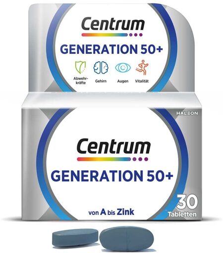 Anwendungsgebiet von Centrum Generation 50+Hochwertiges Nahrungsergänzungsmittel für Best Ager zur täglichen Komplettversorgung mit Mikronährstoffen. Der menschliche Körper ist ein biologisches Meisterwerk in dem hochkomplexe Prozesse ablaufen für die Mikronährstoffe in ausreichender Menge benötigt werden. Die Centrum® Nährstoff-Formel Generation 50+ enthält alle lebensnotwendigen Vitamine sowie wichtige Mineralstoffe und Spurenelemente. Die Formulierung ist speziell auf die Bedürfnisse von Best Agern abgestimmt - zur optimalen Ergänzung Ihrer täglichen Ernährung. Mit nur einer Tablette pro Tag decken Sie den Tagesbedarf vieler Vitamine, Mineralstoffe und Spurenelemente. Das Ergebnis: Der Körper wird durch die mit Sorgfalt zusammengestellte Nährstoffformel ganzheitlich unterstützt. Wirkungsweise von Centrum Generation 50+Abwehrkräfte: Vitamin C, Zink und Selen unterstützen die normale Funktion des Immunsystems. Gehirn: Eisen trägt zu einer normalen kognitiven Funktion und Pantothensäure zu einer normalen geistigen Leistung bei. Augen: Vitamin A trägt zur Erhaltung normaler Sehkraft bei. Vitalität und Energie: Vitamin B6 und B12 tragen zur Verringerung von Müdigkeit und Ermüdung bei. Knochen & Gelenke: Vitamin D und Calcium tragen zur Erhaltung normaler Knochen bei. Haut & Haare: Biotin trägt zur Erhaltung normaler Haut und Haare bei. Muskeln: Kalium und Magnesium tragen zu einer normalen Muskelfunktion bei. Zellschutz: Vitamin E und Kupfer tragen dazu bei, die Zellen vor oxidativem Stress zu schützen. Die Centrum® Formulierungen werden auf Grundlage wissenschaftlicher Forschungen entwickelt und von Nährstoffexperten formuliert. Sämtliche Mikronährstoffe sind auf Sicherheit geprüft und zertifiziert. Centrum Generation 50+ ist glutenfrei laktosefrei Für Diabetiker geeignet ohne Anrechnung von Broteinheiten (BE) Wirkstof ...