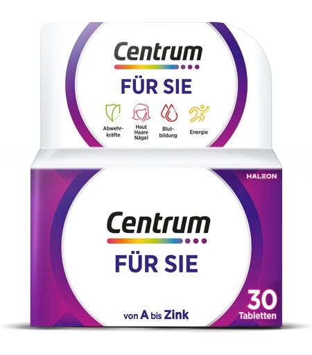 Nahrungsergänzungsmittel sind kein Ersatz für eine ausgewogene und abwechslungsreiche Ernährung und eine gesunde Lebensweise. Centrum® Für Sie, Nahrungsergänzungsmittel Das Frauen-Nährstoff-Paket Für Sie ist speziell für die Bedürfnisse von Frauen formuliert und ergänzt die Ernährung sinnvoll mit Vitaminen, Mineralstoffen und Spurenelementen. Die hochwertige Frauen-Nährstoff-Formel versorgt Sie komplett mit lebensnotwendigen Vitaminen, Mineralstoffen und Spurenelementen Die Formulierung mit Multivitaminen ist speziell für die Bedürfnisse von Frauen entwickelt Die Centrum Verpackungen werden derzeit sukzessive auf ein neues Design umgestellt; während der Umstellungszeit sind beide Versionen im Umlauf. Die Tablettenfarbe ist etwas dunkler als zuvor. Der menschliche Körper ist ein biologisches Meisterwerk in dem hochkomplexe Prozesse ablaufen für die Mikronährstoffe in ausreichender Menge benötigt werden. Die Centrum Frauen-Nährstoff-Formel Für Sie enthält alle lebensnotwendigen Vitamine sowie wichtige Mineralstoffe und Spurenelemente. Die Formulierung ist speziell auf die Bedürfnisse von Frauen abgestimmt - zur optimalen Ergänzung Ihrer täglichen Ernährung. Mit nur einer Tablette pro Tag decken Sie den Tagesbedarf vieler Vitamine, Mineralstoffe ; Spurenelemente. Das Ergebnis: Der Körper wird durch die mit Sorgfalt zusammengestellte Nährstoffformel ganzheitlich unterstützt. Abwehrkräfte: Vitamin C, Zink und Selen unterstützen die normale Funktion des Immunsystems. Gehirn: Eisen trägt zu einer normalen kognitiven Funktion und Pantothensäure zu einer normalen geistigen Leistung bei. Augen: Vitamin A trägt zur Erhaltung normaler Sehkraft bei. Vitalität und Energie: Vitamin B6 und B12 tragen zur Verringerung von Müdigkeit und Ermüdung bei. Knochen ; Gelenke: Vitamin D und Calcium tragen zur Erhaltung normaler Knochen bei. Haut ; Haare: Biotin trägt zur Erhaltung normaler Haut und Haare bei. Muskeln: Kalium und Magnesium tragen zu einer normalen Muskelfunktion bei. Zellschutz: Vitamin E und Kupfer tragen dazu bei, die Zellen vor oxidativem Stress zu schützen.Die Centrum Formulierungen werden auf Grundlage wissenschaftlicher Forschungen entwickelt und von Nährstoffexperten formuliert. Sämtliche Mikronährstoffe sind auf Sicherheit geprüft und zertifiziert. Centrum Für Sie ist: - Für Diabetiker geeignet ohne Anrechnung von Broteinheiten (BE) - glutenfrei - laktosefrei- glutenfreiZutaten:Calciumhydrogenphosphat; Calciumcarbonat; Magnesiumoxid; Füllstoffe: E 460, E 464, E 1200; L-Ascorbinsäure; Trennmittel: E 468, E 470b, E 551, E 553b; Eisen-II-fumarat; DL-alpha-Tocopherylacetat; Nicotinamid; Calcium-D-Pantothenat; Zinkoxid; Pyridoxinhydrochlorid; Riboflavin; Thiaminmononitrat; pflanzliche Öle (Kokos-, Palmkernöl); Beta-Carotin; Kupfersulfat; Retinylacetat; Pteroylmonoglutaminsäure; Chrom-III-chlorid; Natriummolybdat; Kaliumjodid; Natriumselenat; D-Biotin; Phyllochinon; Cholecalciferol; Cyanocobalamin; Farbstoffe: E 120, E 133.Nährwerte: Zusammensetzung pro... ...