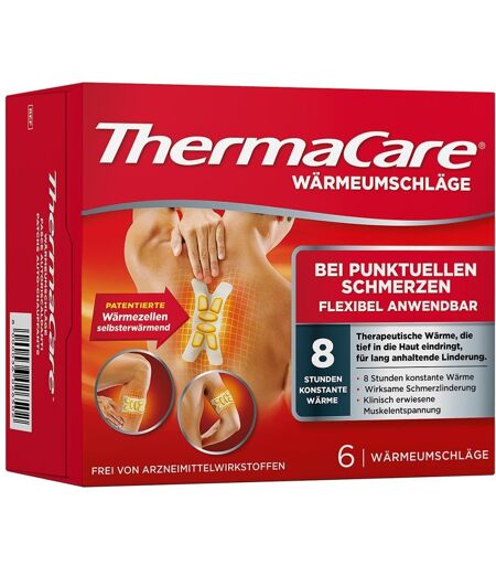 Anwendungsgebiet von ThermaCare bei punktuellen SchmerzenThermaCare bei punktuellen Schmerzen eignen sich besonders gut für eine flexible Anwendung. Die hautfreundlichen Auflagen mit 6 patentierten Wärmezellen sind flexibel einsetzbar und werden mit vier Klebepunkten auf der Haut angebracht. Wirksame und gezielte Linderung von Muskel- und/oder Gelenksschmerzen im Zusammenhang mit: Überanstrengung Zerrungen und Verstauchungen Arthrose Muskelverspannungen Geeignet bei akuten, chronischen und gelegentlichen Schmerzen. Dieses Produkt ist für Patient:innen ab 12 Jahren bestimmt, die das Produkt selbstständig anwenden können. Siehe besondere Warnhinweise und Vorsichtsmaßnahmen für die Anwendung. Wirkungsweise von ThermaCare bei punktuellen SchmerzenDie ThermaCare Wärmeentwicklung basiert auf einem effektiven Naturprinzip - Wärme durch Oxidation. Somit erwärmen sich die Umschläge und Auflagen bei Luftkontakt von selbst und sind frei von jeglichen Arzneiwirkstoffen. So setzt ThermaCare auf natürliche Weise ein Zeichen gegen Muskel-, Regel- und Gelenkschmerzen und unterstützt Sie bei einem schmerzfreien Leben!GegenanzeigenAuf geschädigten Hautflächen, Prellungen oder bei Schwellungen, Diabetes, Durchblutungsstörungen, Rheumatoider Arthritis sowie während der Schwangerschaft sollte dieses Produkt nicht angewendet werden. Während der Stillzeit sowie bei der Anwendung an älteren Personen ist vor der Anwendung dieses Produktes ein Arzt zu konsultieren. DosierungGebrauchsanweisung von ThermaCare bei punktuellen Schmerzen: Reißen Sie den Beutel unmittelbar vor Gebrauch auf. Schneiden Sie nicht in den Wärmeumschlag. Ziehen Sie das Papier ab, um die Klebeseite freizulegen. Mit der Klebeseite zur Haut über den Schmerzbereich legen. Siehe Abschnitt ""Nicht verwenden"" im Hinblick auf Körperstellen, an denen die Wärmeumschläge nicht verwendet werden dürfen. Es kann bis zu 30 Minuten dau ...
