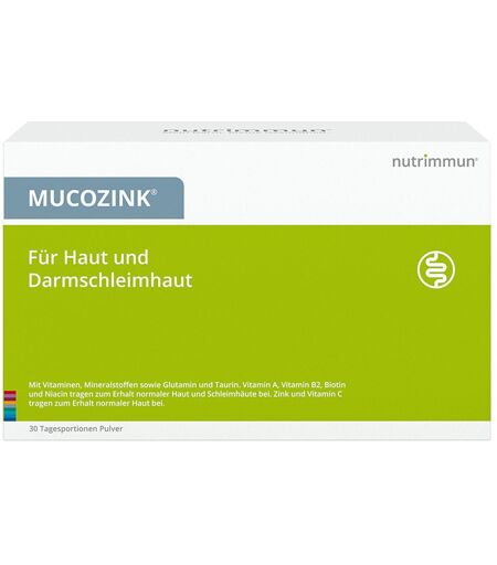 Nahrungsergänzungsmittel sind kein Ersatz für eine ausgewogene und abwechslungsreiche Ernährung und eine gesunde Lebensweise. MUCOZINK® - Für Haut und Darmschleimhaut Nahrungsergänzungsmittel mit Vitaminen, Mineralstoffen sowie Glutamin und Taurin. Vitamin A, Vitamin B2, Biotin und Niacin tragen zum Erhalt normaler Haut und Schleimhäute bei. Zink und Vitamin C tragen zum Erhalt normaler Haut bei. Zink, Vitamin B12, Vitamin D, Folsäure und Magnesium unterstützen die Zellteilung. Vitamin C, Vitamin B2, Vitamin E, Kupfer, Zink und Selen tragen dazu bei, die Zellen vor oxidativem Stress zu schützen. Vitamin C erhöht die Eisenaufnahme. Vitamin D trägt zu einer normalen Aufnahme von Calcium und Phosphor bei. Chrom trägt zum normalen Makronährstoffwechsel bei. Vitamin C, Vitamin B1, Vitamin B2, Vitamin B6, Vitamin B12, Niacin, Biotin, Pantothensäure sowie Kupfer und Magnesium tragen zu einem normalen Energiestoffwechsel bei. Die zusätzlich enthaltenen Aminosäuren L-Glutamin und Taurin sind wichtige Substrate der Darmschleimhautzellen Glutenfrei und laktosefrei Vegetarisch Ohne Farbstoffe Ohne Süßstoffe Mit natürlichem Aroma Langfristige Einnahme möglich. Zutaten: Saccharose, L-Glutamin (10 %), Magnesiumsalze der Zitronensäure, Säuerungsmittel: Zitronensäure, Taurin (2 %), L-Ascorbinsäure (Vitamin C), natürliches Aroma, Maltodextrin, Zinkgluconat, D-alpha-Tocopherylacetat (natürliches Vitamin E), Nicotinamid (Niacin), Calcium-D-pantothenat (Pantothensäure), Rote Beetesaftpulver, Pyridoxinhydrochlorid (Vitamin B6), Riboflavin-5′-phosphat- Natrium (Vitamin B2), Kupfergluconat, Thiaminmononitrat (Vitamin B1), Retinylacetat (Vitamin A), Cholecalciferol (Vitamin D), Pteroylmonoglutaminsäure (Folsäure), Chrom(III)-chlorid, D-Biotin, Natriumselenat (Selen), Cyanocobalamin (Vitamin B12) Nährwerte: Durchschnittliche Nährwerte: pro Tagesportion: NRV* Vitamin A 550 µg RE 69 Vitamin C 300 mg 375 Vitamin E 45 mg a-TE 375 Vitamin B1 5 mg 455 Vitamin B2 5 mg 357 Vitamin B6 10 mg 714 Vitamin B12 9 µg 360 Vitamin D 5 µg 100 Niacin 48 mg NE 300 Pantothensäure 18 mg 300 Folsäure 600 µg 300 Biotin 180 µg 360 Magnesium 250 mg 67 Zink 10 mg 100 Selen 60 µg 109 Kupfer 1 mg 100 Chrom 60 µg 150 L-Glutamin 2 g ** Taurin 0,4 g ** * = Nährstoffbezugswerte gemäß LMIV ** keine Empfehlung der EU vorhanden Verzehrempfehlung: Die Tagesportion Pulver 20 g (je nach Produktauswahl 2 gestrichene Messlöffel oder 1 Portionsbeutel) in ein leeres Glas füllen und unter Rühren in ca. 200 ml stillem Wasser auflösen. Zu oder nach einer Mahlzeit trinken. Alternativ kann die Tagesportion auch auf zwei Mahlzeiten verteilt werden. Kinder von 11-14 Jahren nehmen 1 x täglich 2 gehäufte Teelöffel (13 g). Kinder von 4-10 Jahren nehmen 1 x täglich 1 gehäuften Teelöffel (7 g). Aufbewahrung: Außerhalb der Reichweite kleiner Kinder aufbewahren. Haltbar bei Raumtemperatur.Vor direkter Sonneneinstrahlung und Feuchtigkeit schützen.Nettofüllmenge:Tagesportionsbeutel mit 30 Tagesportionen (entspricht 600... ...