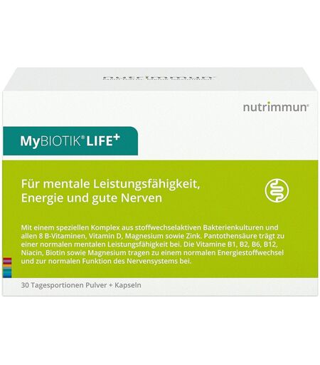 Nahrungsergänzungsmittel sind kein Ersatz für eine abwechslungsreiche und ausgewogene Ernährung und gesunde Lebensweise. MyBIOTIK®LIFE+ Manchmal ist es der eigene Anspruch und vielfach ist es die Kombination der Aufgaben, die das Leben bestimmen und nicht so einfach zu ändern sind. Wenn diese Beanspruchungen zur andauernden Belastung werden, treten häufig Erschöpfungszustände, Konzentrationsschwierigkeiten, Gereiztheit usw. auf. Gerade deshalb gebe ich meinem Körper das PLUS, das er braucht, um den Alltagsbelastungen besser standzuhalten. Einen gut abgestimmten Mikronährstoff-Komplex. Beispielsweise mit B-Vitaminen, Magnesium und Zink – zur Unterstützung meiner Leistungsfähigkeit, meines Energiestoffwechsels und meiner Nerven. Aber auch der Darm spielt für mich eine bedeutsame Rolle. Er ist Energielieferant, Immunorgan, Glückshormonproduzent und steht in engem Kontakt mit dem Gehirn. Er ist ein Schlüssel für mein körperliches und psychisches Wohlbefinden. Damit auch er sich wohlfühlt, versorge ich ihn mit den richtigen, guten Darmbakterien. FÜR MICH Für mentale Leistungsfähigkeit, Engergie und gute Nerven - Gezielte Unterstützung mit MyBIOTIK®LIFE+ Pantothensäure trägt zu einer normalen mentalen Leistungsfähigkeit bei. Die Vitamine B1, B2, B6, B12, Niacin, Biotin, Pantothensäure sowie Magnesium tragen zu einem normalen Energiestoffwechsel bei. Die Vitamine B1, B2, B6, B12, Niacin, Biotin sowie Magnesium tragen zur normalen Funktion des Nervensystems bei. Riboflavin, Niacin, Pantothensäure, Vitamin B6, Folsäure, Vitamin B12 und Magnesium tragen zu einer Reduktion von Müdigkeit und Erschöpfung bei. Vitamin B6, Folsäure, Vitamin B12, Vitamin D und Zink tragen zu einer normalen Funktion des Immunsystems bei. Vitamin B6, Folsäure und Vitamin B12 tragen zu einem normalen Homocystein- Stoffwechsel bei. Pantothensäure trägt zu einer normalen Synthese und Metabolismus von Steroidhormonen, Vitamin D und einigen Neurotransmittern bei Zutaten: Kartoffelstärke, Magnesiumcarbonat, Hydroxypropylmethylcellulose, Zinkgluconat, Nicotinamid (Niacin), Bakterienkulturen (1,9%) (bestehend aus Bifidobacterium longum R0175, Lactobacillus helveticus R0052), Calcium-D-pantothenat (Pantothensäure), Cyanocobalamin (Vitamin B12), Pyridoxinhydrochlorid (Vitamin B6), Riboflavin (Vitamin B2), Thiaminhydrochlorid (Vitamin B1), Cholecalciferol (Vitamin D), Reisextrakt, Pteroylmonoglutaminsäure (Folsäure), D-Biotin Kann Spuren von Milch und Soja enthalten. Nährwerte: Durchschnittliche Nährwerte: pro Tagesportion %RM** Vitamin B1 3,3 mg 300 Vitamin B2 4,2 mg 300 Niacin 48 mg NE 1 300 Pantothensäure 18 mg 300 Vitamin B6 4,2 mg 300 Biotin 150 µg 300 Folsäure 200 µg 100 Vitamin B12 7,5 µg 300 Vitamin D 10 µg 200 Magnesium 112,5 mg 30 Zink 10 mg 100 Bakterienkulturen bestehend aus Bifidobacterium longum R0175 Lactobacillus helveticus R0052 3 x 10 9 KBE* *** * KBE = Koloniebildende Einheiten ** RM = Referenzmenge nach VO (EU) Nr. 1169/2011 *** keine Empfehlung der EU vorhanden... ...