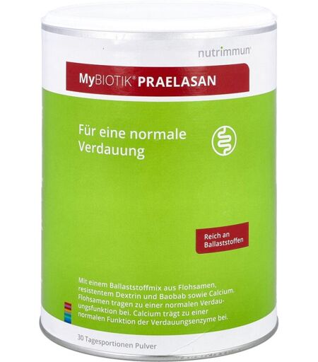 Anwendungsgebiet von Mybiotik Praelasan PulverMybiotik Praelasan Pulver ist eine Nahrungsergänzungsmittel mit einem Ballaststoffmix aus Flohsamenschalen, Maisdextrin und Baobab sowie dem verdauungsrelevanten Mineralstoff Calcium. Sehr gut verträglich: Glutenfrei und laktosefrei Ohne Farbstoffe Ohne Süßstoffe Ohne Aromen Langfristige Einnahme möglich Wirkungsweise von Mybiotik Praelasan PulverFlohsamen regulieren und beruhigen. Sie regen die Darmtätigkeit an und bilden einen Schleim, der einen Schutzfilm auf der Darmschleimhaut bildet. Maisdextrin ist Nahrung für eine gesunde Darmflora. Es dient als Nahrungsquelle für Darmbakterien und unterstützt so das Ökosystem Darm. Baobab enthält viele wertvolle Inhaltsstoffe für die Gesundheit. Baobab-Pulver ist reich an Ballaststoffen, antioxidativen Vitaminen und Mineralstoffen. Calcium trägt zur normalen Funktion von Verdauungsenzymen bei. Wirkstoffe / Inhaltsstoffe / ZutatenZutaten von Mybiotik Praelasan Pulver: Resistentes Dextrin (63 %), gemahlene Flohsamenschalen (21 %), Calciumsalze der Zitronensäure, Baobabfruchtpulver (7 %)GegenanzeigenNahrungsergänzungsmittel sind kein Ersatz für eine ausgewogene und abwechslungsreiche Ernährung. Mybiotik Praelasan Pulver sollten außerhalb der Reichweite von Kindern aufbewahrt werden. Die täglich empfohlene Verzehrmenge sollte nicht überschritten werden. DosierungVerzehrempfehlung von Mybiotik Praelasan Pulver: Die Tagesportion Pulver 14 g (3 gestrichene Messlöffel) in ein leeres Glas füllen und in ca. 200 ml Flüssigkeit auflösen. Die Tagesportion kann über den Tag verteilt vor oder zu einer Mahlzeit eingenommen werden. Tipp: Das geschmacksneutrale Pulver kann je nach Vorliebe in stilles Wasser, Tee, Saft, Joghurt, Müsli oder andere Speisen eingerührt werden. Besondere Personengruppen: Kinder von 6-14 Jahren nehmen 1 x täglich 1½ gestrichene ...
