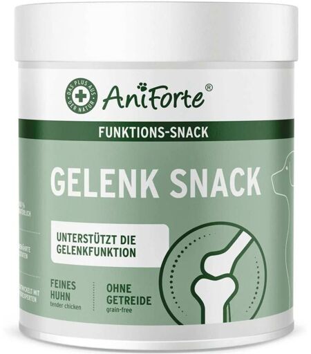AniForte Gelenk Snack Zur Gesunderhaltung der Gelenke AniForte Funktionssnacks werden nur aus besten, 100 % natürlichen Zutaten hergestellt, passen durch ihre Form in jede Tasche, fetten und bröseln nicht. Durch ihre keksartige Konsistenz lassen sie sich leicht teilen und sind für alle Fellnasen, ob groß oder klein geeignet. 100 % natürliche Funktionssnacks mit extra viel feinem Hähnchenfleisch als Monoprotein Mit reiner neuseeländischen Grünlippmuschel in Vollfett-Qualität zur Gesunderhaltung der Gelenke Ohne Getreide Für alle Rassen und jedes Alter geeignet AniForte Gelenk Snacks sind eine schmackhafte und hochverdauliche Belohnung, die aufgrund des extra hohen Anteils an reinem, zartem Hähnchenfleisch besonders herzhaft im Geschmack sind. Die handlichen Leckerlis sind kombiniert mit hochwertigem neuseeländischem Grünlippmuschelpulver (Perna canaliculus) – das Plus für die Gelenke. Funktionssnack mit original neuseeländischer Grünlippmuschel – wichtige Glykosaminoglykane & wertvolle Omega-3-Fettsäuren Grünlippmuschel enthält die bekannten Glykosaminoglykane, welche sich förderlich auf die Gelenke und Knorpel auswirken. Studien konnten zeigen, dass eine Supplementierung mit der Grünlippmuschel, Hunde positiv in der Gangfunktion beeinflussen kann. Es unterstützt die Regeneration des Gelenkknorpels und wirkt sich zudem vorteilhaft auf die Gelenkqualität der Tiere aus. Ihr hoher Anteil an den natürlichen Omega-3-Fettsäuren Docosahexaensäuren (DHA), Eicosapentaensäuren (EPA) und Eicosatetraensäure (ETA) macht die Grünlippmuschel zu einem wertvollen Rohstoff. Unser Anspruch ist hoch. Die fein abgestimmte Rezeptur von AniForte Gelenk-Snacks ist einzigartig, ohne Zugabe künstlicher Zusätze und unter Beachtung höchster Qualitätsstandards hergestellt. Monoprotein, viel Fleischanteil – ohne Getreide Eine fleischige Gaumenfreude: Wir setzen bei unseren Natursnacks auf nur eine hochwertige Proteinquelle mit der Geschmacksrichtung Huhn, und das mit einem außerordentlich hohen Fleischanteil von 88 %. Für eine noch bessere Verträglichkeit: Auf Getreide und Kohlenhydrate haben wir bewusst verzichtet – so können auch Hunde mit Allergien, Unverträglichkeiten und empfindlichen Mägen in den Genuss kommen. Natürlich sind unsere AniForte Gelenk Snacks auch frei von Zuckerzusätzen, künstliche Aroma-, Farb- oder Konservierungsstoffe und ohne synthetische Vitamine. Funktionssnack mit einer besonders zarten Konsistenz und vollem Geschmack AniForte Gelenk Snacks werden schonend hergestellt, damit alle Inhaltsstoffe erhalten bleiben. Dank der soften Textur sind sie besonders handlich, passen in jede Jackentasche, krümeln und zerfallen nicht und lassen sich auch für kleine Hunde einfach mit der Hand teilen. Die weiche Konsistenz macht sie auch für Welpen und ältere... ...