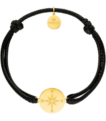 Verstellbares Armband in Schwarz mit einem goldenen Coin im Kompass-Design und PURELEI Logo-Tag. Material Gold: Edelstahl 18K vergoldet Band: Baumwolle Farbe: Schwarz Länge: Beliebig verstellbar Gewicht: 2,2 g ...