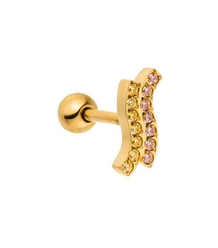 Zweifarbiger, mit Strasssteinen verzierter Piercing in Wellen-Form. Material Gold: Edelstahl 18K vergoldet Silber: Edelstahl Schmuckstein: Zirkonia (Gelb & Rosa) Länge Anhänger (gesamt): 10 mm Gewicht: 0,71 ...