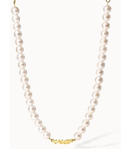 Perlenkette mit geschwungenem via Schriftzug. Aus der Via Kollektion von PURELEI x Millane. Gold: Edelstahl 18K vergoldet Silber: Edelstahl Roségold: Edelstahl 18K rosévergoldet Perlen: Muschelperlen Länge: Verstellbar, 30 - 40 cm Anhänger: Länge 21,9 mm Gewicht: 24,68 g Bitte beachte: Da es sich bei den Perlen um Naturprodukte handelt, können Form und Farbe leicht variieren. Seashell Perlen sind nicht wasserfest und sollten daher vor übermäßiger Feuchtigkeit geschützt werden, um ihre Schönheit zu bewahren. ...