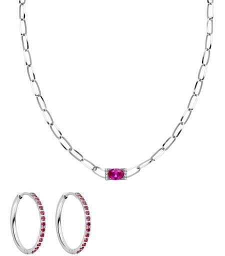 Pretty in Pink: Die Gliederkette mit pinkem Schmucksteinanhänger und die mit pinken Steinchen besetzte Creolen verleihen jedem Outfit einen besonderen Farbtouch. Material: Gold: Edelstahl 18K vergoldet Silber: Edelstahl Roségold: Edelstahl 18K rosévergoldet Schmucksteine: Zirkonia (Fuchsia & Weiß) Romance Kette: Länge: Verstellbar, 40/45 cm Gewicht: 5,2 g Anhänger nicht abnehmbar Romance Ohrringe: Größe: 18 mm Durchmesser Gewicht: 2,35 g (beide) ...