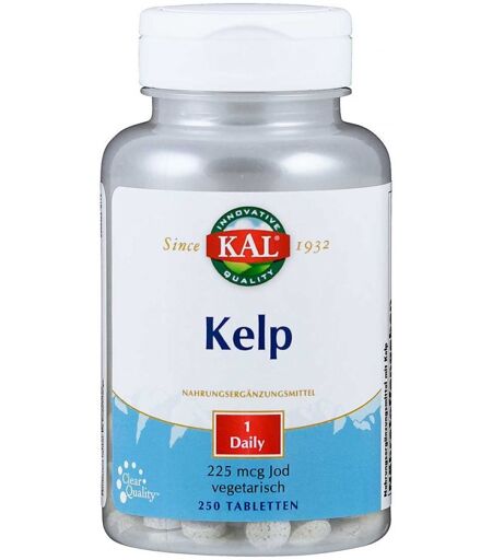 Anwendungsgebiet von Kelp 225 [my]g Jod TablettenKelp 225 [my]g Jod Tabletten sind ein Nahrungsergänzungsmittel mit Kelp. Die Bezeichnung Kelp stammt aus dem Englischen und bedeutet „Tang“. Kelp ist eine reiche natürliche Quelle von Mineralstoffen und Spurenelementen. Die essbaren Algen besitzen mehr Vitamine und Mineralstoffe als jedes andere Nahrungsmittel. So enthält Kelp Vitamin B2, Niacin, Cholin, Carotin, Alginsäure und dreiundzwanzig Mineralstoffe (Jod, Kalzium, Phosphor, Eisen, Natrium, Kalium, Magnesium, Schwefel, Chlor, Kupfer, Zink, Mangan und Spuren von Barium, Bor, Chrom, Lithium, Nickel, Silber, Titan, Vanadium, Aluminium, Strontium und Silizium). Vor allem aber wegen ihres natürlichen Jodgehalts ist die Braunalge Kelp bekannt geworden. Jod ist als lebensnotwendiges Spurenelement zur Bildung der Schilddrüsenhormone notwendig. Die Schilddrüse befindet sich im unteren Bereich des Halses und erzeugt Hormone, die wichtige Körperfunktionen steuern und weitreichenden Einfluss auf das Arbeiten aller Körperfunktionen haben. Jod besitzt aber auch nichthormonelle Eigenschaften. Jod kommt in der Nahrung neben Meeresalgen vor allem in Krustentieren, Scholle, Seelachs, Garnelen, Miesmuscheln, Kabeljau, Dorsch, Makrele, Heilbutt, Hering und Tunfisch vor. Jod trägt zu einer normalen Funktion des Nervensystems bei Jod trägt zu einem normalen Energiestoffwechsel bei Jod trägt zu einer normalen Produktion von Schilddrüsenhormonen und zu einer normalen Schilddrüsenfunktion bei Jod trägt zur Erhaltung normaler Haut bei Jod trägt zu einer normalen kognitiven Funktion bei Wirkstoffe / Inhaltsstoffe / ZutatenKelp 225 [my]g Jod Tabletten enthält: Zutaten: Füllstoff Cellulose, Kelp, Trennmittel Speisefettsäuren Nährstoffangaben 1 Tablette enthält Menge/Einheit % NRV* Kelp, darin entha ...
