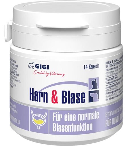 Anwendungsgebiet von GIGI VET Harn & Blase N14 GIGI VET Harn & Blase N14 Diese hochwertige, tierärztlich entwickelte Formel unterstützt gezielt die Gesundheit des Harntrakts bei Hunden und Katzen – ideal bei wiederkehrenden Blasenentzündungen, Harninkontinenz oder Problemen beim Wasserlassen. Ideal geeignet für:Hunde und Katzen mit Blasenschwäche oder InkontinenzTiere mit chronischen oder wiederkehrenden HarnwegsinfektenÄltere Tiere mit altersbedingten Problemen beim WasserlassenNach tierärztlicher Rücksprache auch unterstützend bei Struvitsteinen und Reizblase Ihre Vorteile auf einen Blick:Natürliche Unterstützung der BlasenfunktionFördert die gesunde Funktion von HarnwegenMit bewährten Pflanzen & VitaminenSchonend, gut verträglich – ohne unnötige ZusätzeEntwickelt von Tierärzten & Spezialisten für TiergesundheitWirkungsweise von GIGI VET Harn & Blase N14 Cranberry – zur Unterstützung der Blasengesundheit, bekannt für ihre antibakterielle Wirkung durch Proanthocyanidine (PAC), die helfen können, schädliche Bakterien an der Blasenwand zu binden und auszuscheiden Bärentraubenblätter – traditionell eingesetzt bei Harnwegsproblemen, fördern die natürliche Funktion der Harnwege Calciumascorbat (Vitamin C) – stärkt die Immunabwehr des Harntrakts und schützt die Schleimhäute Magnesium – wichtig für die Muskelkontrolle, auch der BlasenmuskulaturWirkstoffe / Inhaltsstoffe / ZutatenInhaltsstoffe von GIGI VET Harn & Blase N14:Dextrose (13.2.2.) – 63,16 %Bärentraubenblätter (Arctostaphylos uva-ursi) (Erzeugnisse aus der Verarbeitung von Pflanzen 13.1.7.) – 13,10 %Cranberry (Vaccinium macrocarpon) Früchte (Erzeugnisse aus der Verarbeitung von Pflanzen 13.1.7.) – 10,54 %Magnesiumstearat (11.2.10) – 1 %Analytische Bestandteile:Rohprotein 21 %, Rohasche 3 %, Rohöl und -fett 0,4 %, Rohfaser < 0,2 %, Ca 6,7 %, S 4 %, Natrium 1,1 %, Mg 0,25 %, Ölsäure 0,05 %.Zusatzstoffe pro kg:Technolog ...