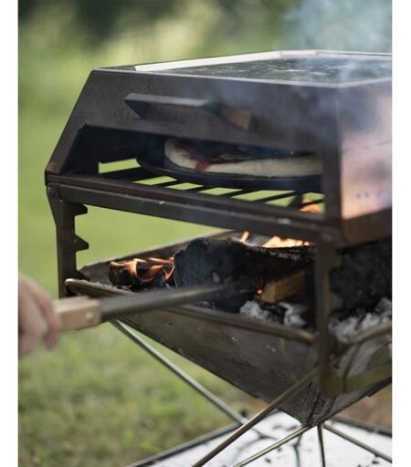 Der Snow Peak Field Oven ist auf das Takibi Pack & Carry Fireplace Kit in der größten Version zugeschnitten und lässt sich stabil auf der Feuerschale fixieren. Die Kerben an den Standfüßen ermöglichen es dir, den Ofen auf unterschiedlicher Höhe aufzustellen und damit auch ein wenig die Hitze zu regulieren. Der geschlossene Deckel fängt die aufsteigende Hitze der Feuerschale auf, sodass sich in dem Snow Peak Field Oven ausreichend Wärme zum Backen entwickelt. Durch das Standsystem kannst du während der Zubereitung immer weiter Holz nachlegen, damit der Ofen nicht auskühlt. Auf dem Deckel des Snow Peak Field Ovens kannst du zusätzlich Kohlen platzieren, um auch von oben eine gewisse Hitzeeinwirkung zu erreichen – zum Beispiel, um deine Pizza zu überbacken. Hierfür und für andere Backwaren hat der Hersteller auch eine robuste Keramikplatte mitgeliefert, die dir als Unterlage für deine leckeren Gerichte dient. Mit dem abnehmbaren Lifter lässt sich die Platte schließlich sicher transportieren und das Gitter auf dem Standsystem dient als Boden. Nach dem Einsatz darf die Keramikplatte in ihre eigene Schutzhülle wandern, während der Rest des Snow Peak Field Ovens kompakt mit den mitgelieferten Spanngurten verzurrt wird. Während die klassische Outdoorküche also bisher nur Möglichkeiten zum Kochen, Braten und Grillen geliefert hat, trägt der Snow Peak Field Oven mit seiner Backofenfunktion nun das letzte Puzzleteil dazu bei, dass du dich auch unter freiem Himmel über eine vollwertig ausgestattete Küche mit all ihren dazugehörigen leckeren Ergebnissen freuen kannst. ...