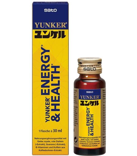 Anwendungsgebiet von Yunker Energy & Health TonikumNahrungsergänzungsmittel mit Gelée Royale, Pflanzenextrakten, B‐Vitaminen und KoffeinFühlen Sie sich trotz ausreichend Schlaf oft müde, angespannt und wenig leistungsfähig? Dann ist Yunker Energy & Health Tonikum die ideale Unterstützung für Ihren Alltag. Dieses hochwertige Nahrungsergänzungsmittel vereint Gelee Royale, pflanzliche Extrakte, B-Vitamine und Koffein in einer durchdachten Rezeptur, um Ihnen neue Energie zu verleihen – ganz ohne Nebenwirkungen.Besonders in stressigen Lebensphasen kann es schwierig sein, den Körper optimal mit Nährstoffen zu versorgen. YUNKER Energy & Health hilft Ihnen, Ihre körpereigenen Speicher gezielt und schnell aufzufüllen – für mehr Fokus, mentale Stärke und Vitalität.Rote Datteln & Guarana: Unterstützen Energie und KonzentrationGelee Royale: Stärkt das Immunsystem und die LeistungsfähigkeitVitamin-B-Komplex: Für Nerven, Stoffwechsel und mentale KlarheitKoffein: Gegen Müdigkeit – ohne starke Belastung des KörpersNiacin, Pantothensäure, Riboflavin, Vitamin B6 & B12 tragen zur Verminderung vonMüdigkeit bei.Die Vitamine Riboflavin, Vitamin B1, B6 & B12 tragen zum normalen Energiestoffwechselbei.Koffein hilft, die Aufmerksamkeit zu verbessern und die Wachheit zu steigern.Wirkstoffe / Inhaltsstoffe / ZutatenZutaten von Yunker Energy & Health Tonikum:Zucker, Extrakt aus Roten Datteln, Guayana‐Extrakt, Kaffeebohnen‐Extrakt, Gelée royale, Säuerungsmittel, Apfelsäure, Karamell, Konservierungsstoff Natriumbenzoat, Säureregulator Natriummhydroxid, Aroma, Ethanol, Pantothensäure, Niacin, Vitamin B1, Vitamin B2, Vitamin B12, Vitamin B6GegenanzeigenBei bekannter Überempfindlichkeit gegen einen der Inhaltsstoffe sollte das Produkt nicht eingenommen werden.DosierungVerzehrempfehlung von Yunker Energy & Health Tonikum:
