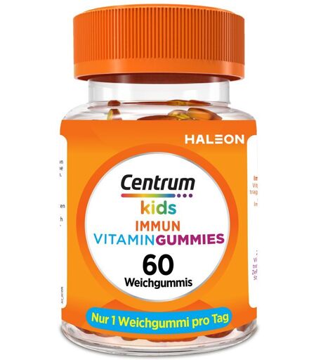 Nahrungsergänzungsmittel sind kein Ersatz für eine ausgewogene und abwechslungsreiche Ernährung und eine gesunde Lebensweise.Centrum Kids Immun Vitamin Gummies Nahrungsergänzung in lecker - Centrum Vitamin Gummies vereinen wichtige Vitamine und Zink in Form von Gummibärchen als Alternative zu Tabletten Vitamin C und Zink tragen zum Schutz der Zellen vor oxidativen Stress bei Vitamin C, D und Zink tragen zu einer normalen Funktion des Immunsystems bei Keine künstlichen Farbstoffe, keine künstlichen Aromen Für die Gesundheit zu sorgen, hat noch nie so gut geschmeckt!Centrum IMMUN Vitamin Gummies: Leckere Unterstützung für das Immunsystem von Kindern ab 4 Jahren – mit Vitamin C, D und Zink zur Unterstützung der Abwehrkräfte! Obst und Gemüse stehen nicht an erster Stelle bei Deinem Kind? Du suchst nach Vitaminen und Mineralstoffen zur Ergänzung einer ausgewogenen Ernährung? Dann kannst Du die Ernährung Deines Kindes ganz einfach und lecker mit den Vitamin Gummies von Centrum ergänzen und so eine gesunde Lebensweise unterstützen. Bereits ein Gummie trägt dazu bei, den täglichen Vitamin- und Mineralstoffbedarf Deines Kindes zu ergänzen. Nahrungsergänzung in lecker - Centrum Vitamin Gummies vereinen wichtige Vitamine und Mineralstoffe in Form von Gummibärchen als Alternative zu Tabletten. Die kids IMMUN Vitamin Gummies beinhalten vier Vitamine und einen essentiellen Mineralstoff: Vitamin C, D und Zink tragen zu einer normalen Funktion des Immunsystems bei und unterstützen so gezielt die Abwehrkräfte. Vitamin C und Zink tragen zum Schutz der Zellen vor oxidativen Stress bei. Vitamin D trägt zur Erhaltung normaler Knochen und Zähnen sowie zu einer normalen Muskelfunktion bei. 1 Weichgummi pro Tag. Weichgummi kauen, bis es sich auflöst, kann ohne Wasser eingenommen werden. Das Produkt kann eine Erstickungsgefahr darstellen und sollte unter Aufsicht von Erwachsenen vollständig gekaut werden. Die empfohlene tägliche Verzehrsmenge darf nicht überschritten werden. Nahrungsergänzungsmittel sind kein Ersatz für eine ausgewogene, abwechslungsreiche Ernährung und eine gesunde Lebensweise. Wenn Ihr Kind weitere Nahrungsergänzungsmittel einnimmt, lesen Sie die Produktangaben, weil sie den gleichen Nährstoff enthalten können. Außerhalb der Reichweite von Kindern lagern. Trocken und nicht über 25 °C lagern. Dose nach Gebrauch wieder verschließen. Nicht verwenden, wenn die Schutzfolie vor erstmaligem Gebrauch beschädigt ist. Zutaten:Glukosesirup; Zucker; Gelatine; L-Ascorbinsäure; Wasser; Maltodextrin; DL-alpha-Tocopherylacetat; Zinksulfat; Säuerungsmittel: Citronensäure; natürliches Orangenaroma; färbende Lebensmittelkonzentrate (Paprika, Karotte); pflanzliche Öle (Kokos-, Rapsöl); Süßungsmittel: Steviolglycoside; Retinylacetat; Überzugsmittel: Carnaubawachs, Bienenwachs; Cholecalciferol.Nährwertangaben: Zusammensetzung Pro 1 Weichgummi % NRV* Vitamin A 330 µg RE 41% Vitamin D 5 µg 100% Vitamin E 5 mg alpha-TE 42% Vitamin C 60 mg 75% Zink 2,8 mg 28%... ...