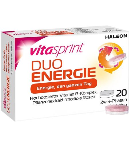 Anwendungsgebiet von Vitasprint Duo Energie TablettenVitasprint Duo Energie Tabletten unterstützen direkt und langanhaltend Ihr Energielevel*. Die 2-Phasen-Innovation versorgen Sie sofort mit hochdosiertem Vitamin B-Komplex und kontinuierlich mit dem Pflanzenextrakt Rhodiola Rosea. Ihr Energiestoffwechsel wird den ganzen Tag unterstützt. *Vitamine B1, B2, B3, B5, B6, B7 und B12 tragen zu einem normalen Energiestoffwechsel bei.Wirkstoffe / Inhaltsstoffe / ZutatenZutaten von Vitasprint Duo Energie Tabletten: Füllstoff: mikrokristalline Cellulose, Rosenwurz-Extrakt (Rhodiola rosea L.) Kakaosamen- Extrakt (Theobroma cacao L.) Stabilisator Hydroxypropylmethycellulose Füllstoff Calciumcarbonat Nicotinamid Trennmittel Polyvinylpolypyrrolidon fäarbendes Lebensmittel Rote-Bete- Saft Pryridoxinhydrochlorid Calcium- D- pantothenat Riboflavin Thiaminmononitrat Trennmittel Magnesiumsalze der Speisefettsäuren Cyanocabalamin Überzugmittel Hydroxypropylmethylcellulose, Speisefettsäauren, mikrokristalline Cellulose, Pteroylmonoglutamin-säure, D-Biotin. 1 Tablette enthält: Vitamin B-Komplex mit allen 8 B- Vitaminen , Pflanzenextrakt Rhodiola RoseaGegenanzeigenBei bekannter Überempfindlichkeit gegen einzelne Inhaltsstoffe sollte Vitasprint Duo Energie Tabletten nicht verzehrt werden.DosierungVerzehrempfehlung von Vitasprint Duo Energie Tabletten: 1 Tablette pro Tag mit Flüssigkeit, vorzugsweise morgens zu einer Mahlzeit, einnehmen. HinweiseNahrungsergänzungsmittel sind kein Ersatz für eine ausgewogene und abwechslungsreiche Ernährung und eine gesunde Lebensweise. Die angegebene empfohlene tägliche Verzehrmenge darf nicht überschritten werden. Außerhalb der Reichweite von kleinen Kindern aufbewahren. Vitasprint Duo Energie Tabletten können in Ihrer Versandapotheke www.juvalis.de erworben werden. ...