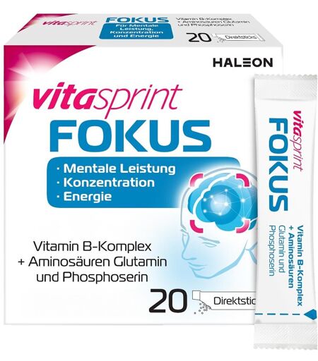 Anwendungsgebiet von Vitasprint Fokus DirektsticksVitasprint Fokus Direktsticks versorgen Sie mit einem Nährstoffkomplex aus B-Vitaminen und den Aminosäuren Phosphoserin und Glutamin. Die Vitamine B2, B3, B6 und B12 tragen zu einem normalen Energiestoffwechsel und zur Verringerung von Müdigkeit und Ermüdung bei. Pantothensäure (Vitamin B5) trägt zu einer normalen geistigen Leistung bei. Die Aminosäuren Phosphoserin und Glutamin sind beteiligt am Aufbau und der Funktion der Nervenzellen. Wirkstoffe / Inhaltsstoffe / ZutatenZutaten von Vitasprint Fokus Direktsticks: L-Glutamin Fruktose Füllstoff Sorbit D,L-Phosphoserin Nicotinamid Trennmittel Siliciumdioxid Calcium-D-pantothenat Aroma Pyridoxinhydrochlorid Süßungsmittel Sucralose Acesulfam K, Cyclamat Riboflavin Thiaminmononitrat Stabilisator Guarkern-mehl Pteroylmono-glutaminsäure Cyanocobalamin. 1 Direktstick enthält: B-Vitamine (B1, B2, B3, B5, B6, B9, B12), 100 mg Phosphoserin, 1000mg L-GlutaminGegenanzeigenBei bekannter Überempfindlichkeit gegen einzelne Inhaltsstoffe sollte Vitasprint Fokus Direktsticks nicht verzehrt werden.DosierungVerzehrempfehlung von Vitasprint Fokus Direktsticks: 1 Stick pro Tag direkt im Mund auflösen.HinweiseNahrungsergänzungsmittel sind kein Ersatz für eine ausgewogene und abwechslungsreiche Ernährung und eine gesunde Lebensweise. Die angegebene empfohlene tägliche Verzehrmenge darf nicht überschritten werden. Außerhalb der Reichweite von kleinen Kindern aufbewahren. Vitasprint Fokus Direktsticks können in Ihrer Versandapotheke www.juvalis.de erworben werden. ...