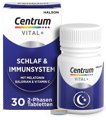 Anwendungsgebiet von Centrum Vital+ Schlaf & Immunsystem Tabletten Centrum Vital+ Schlaf & Immunsystem mit Melatonin, Vitamin C, Zink, Baldrian, 30 TablettenCentrum Vital+ Schlaf & Immunsystem Tabletten sind ein Nahrungsergänzungsmittel mit Mineralstoffen, Vitaminen, Baldrianwurzel-Extrakt und Melatonin für Erwachsene. Centrum Vital¹+ Schlaf² & Immunsystem³ bietet einen hochwertigen 2-Phasen Nährstoffkomplex für für erholsamen Schlaf², Immunsystem³ und Zellregeneration⁴. Mit zunehmenden Alter lassen sich Veränderungen im Schlafmuster feststellen. Außerdem nimmt im Alter die Funktion des Immunsystems ab. Um den Körper für einen erholsamen Schlaf und ein starkes Immunsystem zu unterstützen, benötigt er spezifische Nährstoffe. Hier kann Centrum Vital+ Schlaf & Immunsystem als wertvolle Ergänzung dienen. Die darin enthaltenen Mikronährstoffe tragen zur Unterstützung dieser wichtigen Funktionen bei. Neben Baldarian enthält unser Nährstoffkomplex Melatonin, welches trägt dazu bei, die Einschlafzeit zu verkürzen. Die positive Wirkung stellt sich ein, wenn kurz vor dem Schlafengehen 1 mg Melatonin aufgenommen wird. Darüber hinaus tragen Vitamin C und Zink zu einer normalen Funktion des Immunsystems bei. Unsere 2-Phasen-Technologie setzt die Nährstoffe in zwei Phasen frei und sorgt dadurch für eine optimierte Nährstoffaufnahme. Der Schlüssel für körperliche Vitalität liegt in den Zellen. Deshalb unterstützt unterstützt Centrum Vital¹+ Schlaf² & Immunsystem³ während der nächtlichen Regenerationsphase auch die Zellerneuerung. Zink spielt dabei eine wichtige Rolle, da es eine Funktion bei der Zellteilung hat und somit den Zellstoffwechsel unterstützt. Die Einnahme von Centrum Vital+ Schlaf & Immunsystem ist einfach und komfortabel. Die Filmtabletten sind umhüllt und deshalb leicht zu schlucken. Nehmen Sie eine Tablette täglich abends kurz vor dem Schlafengehen mit Flüssigkeit ein, um die nächtliche ...