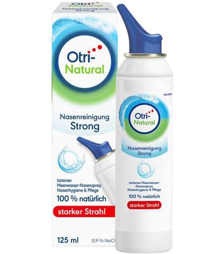 Anwendungsgebiet von Otrinatural Nasenreinigung Strong OTRINATURAL NASENREINIGUNG STRONG AUS DER OTRIVEN-FAMILIE Otrinatural Nasenreinigung Strong ist ein isotones Nasenspray, das hilft, die Nase gesund zu erhalten und sekundären HNO-Infektionen vorzubeugen. Die Nasenspülung ist eine isotone Meerwasserlösung (0,9 % NaCl), die von Natur aus reich an Mineralsalzen und Spurenelementen des Meeres ist. Sie reinigt die Nasenhöhlen und befeuchtet die Nasenschleimhaut. Unsere isotone Nasenspülung unterstützt die Reinigung der Nasenhöhlen bei Erkältungen, Allergien und Infektionen der oberen Atemwege. Sie ist frei von Konservierungsstoffen oder anderen chemischen Zusätzen. Der blaue Sprühkopf der OtriNatural Nasenreinigung Strong erzeugt einen starken Strahl für eine intensive Spülung. Das Meerwasser Nasenspray spült überschüssigen Schleim und darin enthaltene Krankheitserreger, Allergene und Schadstoffe aus. Zur täglichen Anwendung, um die Nase gesund zu erhalten. OtriNatural Nasenreinigung Strong ist für alle Altersgruppen ab 2 Jahren, und auch während der Schwangerschaft und Stillzeit geeignet. Sie kann in Kombination mit wirkstoffhaltigen, abschwellenden Nasensprays verwendet werden, vorzugsweise unmittelbar vor deren Anwendung. Für Kinder ab 2 Jahren werden 1 bis 2 Sprühstöße je Nasenloch, 2- bis 3-mal täglich empfohlen. Für alle Altersgruppen ab 6 Jahren beträgt die empfohlene Dosierung 1-3 Sprühstöße je Nasenloch, 2- bis 4-mal täglich.Wirkstoffe / Inhaltsstoffe / ZutatenOtrinatural Nasenreinigung Strong enthält:Wirkstoffe: Meerwasser 28 %, gereinigtes Wasser 72 % (1 ml Lösung enthält 0,28 ml Meerwasser), entspricht 0,9 % Natriumchlorid (NaCl).Wirkstoffstärke: 0,9 % NaClInhaltsstoffe: Meerwasser 28 %, gereinigtes Wasser 72 % (1 ml Lösung enthält 0,28 ml Meerwasser), entspricht 0,9 % Natriumchlorid (NaCl). Frei von Konservierungsstoffen oder anderen chemischen Zusätzen.GegenanzeigenBei bekannter Überempfindlichkeit gegenüber e ...