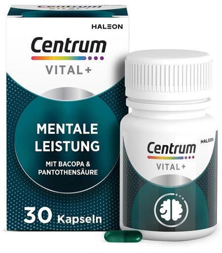 Anwendungsgebiet von Centrum Vital+ Mentale Leistung Kapseln Centrum Vital+ Mentale Leistung - Hochwertiger Nährstoffkomplex für mentale Leistungsfähigkeit² & Zellregeneration³, Bacopa, Phosphatidylserin & -cholin, Pantothensäure, Jod, Vitamin B6, Vitamin B12, 30 KapselnCentrum Vital+ Mentale Leistung Kapseln sind ein Nahrungsergänzungsmittel mit Bacopablatt-Extrakt, Phosphatidylserin, Phosphatidylcholin, Vitaminen und Jod für Erwachsene. Centrum Vital¹+ Mentale Leistung² bietet einen hochwertigen Nährstoffkomplex für geistige Leistungsfähigkeit² und Zellregeneration³. Im Alter verändert sich unser Gehirn, wodurch Gedächtnis und Konzentration beeinträchtigt werden können. Damit der Körper während dieser Veränderungen optimal versorgt wird, benötigt er spezifische Nährstoffe. Hier kann Centrum Vital¹+ Mentale Leistung² als wertvolle Ergänzung dienen. Die darin enthaltenen Mikronährstoffe tragen zur Unterstützung wichtiger Funktionen des Gedächtnis und der Konzentration² bei. Unser Nährstoffkomplex enthält Bacopablatt-Extrakt und Phosphatidylserin & -cholin. Hinzu kommen Vitamin B12, welches zu einem normalen Energiestoffwechsel beiträgt. Pantothensäure, die zu einer normalen geistigen Leistung beiträgt und Jod, welches zu einer normalen kognitiven Funktion beiträgt. Der Schlüssel für körperliche Vitalität liegt in den Zellen. Deshalb unterstützt Centrum Vital¹+ Mentale Leistung² während der nächtlichen Regenerationsphase auch die Zellerneuerung³. Vitamin B12 spielt dabei eine wichtige Rolle, da es eine Funktion bei der Zellteilung hat und somit den Zellstoffwechsel unterstützt. Die Einnahme von Centrum Vital1+ Mentale Leistung² ist einfach und komfortabel. Die Kapseln haben eine pflanzliche Hülle, sind vegan und weisen eine kleine Größe auf. Nehmen Sie eine bis zwei Kapsel(n) täglich mit Flüssigkeit ein, vorzugsweise abends, um die n ...