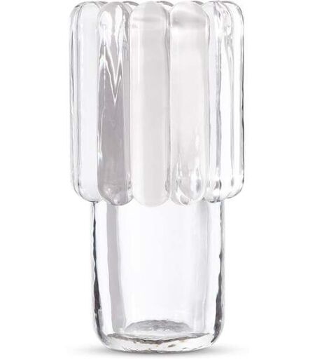 Die Tom Dixon Press Medium Vase besticht durch ihre einzigartige Ästhetik, die der geriffelten Struktur aus transparentem Glas zu verdanken ist. Einmal mehr beweist die britische Designmarke ihr Faible für extravagante Entwürfe und liefert mit der Press Serie eine Kollektion an industriell gepressten Glasobjekten, die so entwickelt sind, dass sie Licht einfangen und wunderschön brechen. Die Tom Dixon Press Medium Vase aus dickwandigem transparentem Glas steht schmal und stabil im Raum und sticht durch ihre besondere Form ins Auge. Etwa in der Mitte der Vase treffen die glatte Oberfläche des unteren Teils und die aus Rillen gefertigte obere Hälfte aufeinander und münden in einem spannenden Kontrast. Die vertrauten Formen des dekorativen Wohnaccessoire entstehen in einem besonderen Herstellungsverfahren, in welchem große Kugeln aus geschmolzenem Glas bei 1.200 Grad Celsius fallen gelassen ... ...