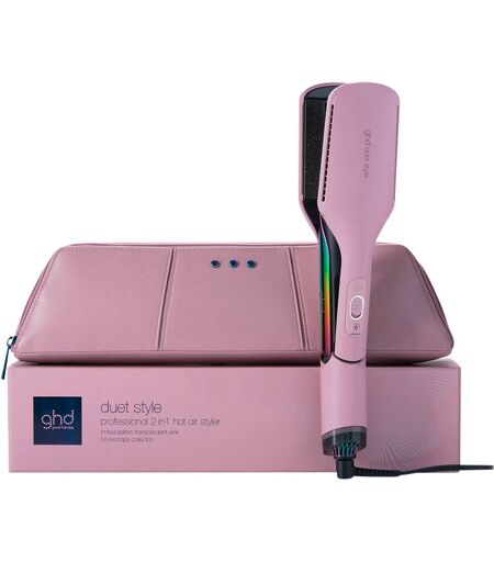 ghd Futurescape Collection. Entfliehe in ein digitales Utopia mit der ghd Futurescape Collection. Sie vereint Beauty und Tech, um Individualität mit endlosen Möglichkeiten zu inspirieren. Dein Schicksal für einen good hair day erwartet Dich mit dem ghd duet style™ professional 2-in-1 Hot Air Styler in der limitierten Edition transcendent pink mit irisierenden Akzenten,* zusammen mit einem gratis Hitzeschutz-Etui (im Wert von 20 €), das auch als hitzebeständige Styling-Unterlage** dient. ghd duet style™ ist der erste 2-in-1 Hot Air Styler,*** der Dein Haar von nass zu gestylt verwandelt – ganz ohne Hitzeschäden.**** TROCKNEN & STYLEN MIT NUR EINEM TOOL - Die revolutionäre Air-Fusion™ Technologie besteht aus der einzigartigen Kombination modernster innerer Aerodynamik mit 4 intelligenten Platten in einer maßgeschneiderten ghd-Stylingkammer. Sie liefert einen ultrakonzentrierten Luftstrom durch ein von Experten entworfenes Luftgitter, das in Synergie mit den intelligenten Niedrigtemperatur-Platten arbeitet, um das Haar gleichzeitig effizient zu trocknen und zu stylen. Für schnelleres Styling und noch nie dagewesene Haarergebnisse,***** mit nur einem Gerät. LEISTUNGSFÄHIGES STYLING MIT NIEDRIGER TEMPERATUR - Die smarten Infinity Sensoren halten eine gleichmäßige Temperatur vom Ansatz bis zu den Spitzen aufrecht, um eine erstklassige Trocknungsleistung zu erzielen und gleichzeitig die natürliche Feuchtigkeit Deines Haares zu erhalten.† Von nassem Haar zu glattem Styling ohne Hitzeschäden,**** ohne Zischen oder Verbrennungsgeruch, für beispiellos schöne und geschmeidige Haarergebnisse bis zu 48 Stunden***** mit 42 % höherem Schutz vor Luftfeuchtigkeit.†† LUXURIÖSE ERGEBNISSE JEDEN TAG - Der exklusive Shine Shot™ Modus für trockenes Haar verwandelt das Tool in einen Styler ohne Luftstrom mit der optimalen Stylingtemperatur 185 °C, um sofort frizzfreies Haar,***** 2x mehr Glanz und 3,5x mehr Haarbändigung zu ermöglichen.† KOMPROMISSLOSES STYLING - Die hochentwickelten, leicht gleitenden Platten mit Ultra-Glanz-Beschichtung sorgen für sanftes und reibungsloses Gleiten, für ein müheloses Styling. LEISES STYLING-ERLEBNIS - Das maßgeschneiderte Akustiksystem bietet einen niedrigeren Geräuschpegel***** für ein angenehmeres und verfeinertes Styling-Erlebnis zu Hause oder im Friseursalon. ENERGIESPARENDES STYLING - Entwickelt mit einem Höchstmaß an Leistung, Effizienz und Ästhetik: Unsere einzigartige umweltfreundliche Aerodynamik minimiert die Energieverschwendung für bis zu 45 % weniger Energieverbrauch.††† PEACE OF MIND - Schlafmodus: Schaltet sich nach 30 Minuten ohne Verwendung automatisch ab. Mit Plattenschutzkappe und professionellem 2,7 m langem Kabel. 2 Jahre Herstellergarantie. *Die Farbe kann bei jedem einzelnen Produkt aufgrund des irisierenden Finishs variieren. Zudem kann die Produktfarbe aufgrund der Lichtverhältnisse während der Aufnahmen leicht von den Abbildungen abweichen. **Das Hitzeschutz-Etui ist nur für die Verwendung mit ghd Produkten... ...