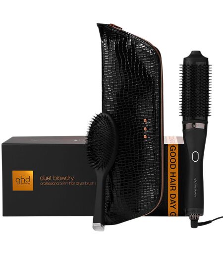 ghd duet blowdry™ Geschenkset. Bring Glamour in die festliche Saison und genieße verführerische und zeitlose good hair days mit dem ghd duet blowdry™ Geschenkset. Das Geschenkset beinhaltet die ghd duet blowdry™ professional 2-in-1 Hair Dryer Brush, eine ghd the dresser - oval dressing brush (im Wert von 35 €*), eine praktische Reinigungsbürste und eine Hitzeschutz-Tasche, die sich zu einer hitzebeständigen Styling-Unterlage entfalten lässt.¹ ghd duet blowdry™ ist die 2-in-1 Hair Dryer Brush von ghd, die das Haar gleichzeitig trocknet und diesem mehr Form gibt. Diese Heißluftbürste ist der schnellste Weg, um einen salonwürdigen Blow Dry mit Form und Fülle zuhause zu kreieren – für geschmeidiges und voluminöses Haar. Wet to Blow Dried mit 3x mehr Volumen3 ganz ohne Hitzeschäden.4 GLEICHZEITIG TROCKNEN UND STYLEN MIT NUR EINEM GERÄT - Die revolutionäre Heat-Air Xchange Technologie™ kombiniert einen kontrollierten Luftstrom mit einer beheizten Platte und sanft gleitenden, beheizten Borsten – damit Du Dein Haar effizient in nur einem Schritt trocknen und stylen kannst. LEISTUNGSFÄHIGES STYLING BEI NIEDRIGER TEMPERATUR - Zwei Wärmesensoren überwachen die Temperatur 400 Mal pro Sekunde, sodass die optimale Stylingtemperatur für nasses Haar von 120 °C auf der Platte und maximal 150 °C Luftstromtemperatur konstant gehalten wird. Die elliptische Form des Bürstenkopfs ermöglicht präzises Styling direkt vom Haaransatz an. Entwickelt für alle Haartypen. Vereinfache Deine Routine, indem Du Föhn und Bürste durch ghd duet blowdry™ ersetzt. Für einen noch nie dagewesenen Blow Dry Look – ohne Hitzeschäden,4 ohne Frizz 5 und mit 50 % mehr Glanz.6 ENERGIESPARENDES STYLING - Entwickelt mit einem Höchstmaß an Leistung, Effizienz und Ästhetik: Entdecke die energieeffiziente Art des Haare Trocknens: ghd duet blowdry™ benötigt 40 % weniger Energie als ein Haartrockner 7 und bietet einen gesprächsfreundlichen Geräuschpegel. PEACE OF MIND - Schlafmodus: ghd duet blowdry™ schaltet sich automatisch ab, wenn die Hair Dryer Brush 30 Minuten nicht benutzt wird. Die mitgelieferte hitzeresistente Tasche ist die ideale Aufbewahrung für unterwegs und lässt sich durch Öffnen in eine hitzeresistente Matte verwandeln, auf der Dein ghd duet blowdry™ beim Stylen abgelegt werden kann. Mit Reinigungsbürste und professionellem 2,7 m langem Kabel. 2 Jahre Herstellergarantie. Die ghd the dresser - oval dressing brush entwirrt und pflegt Dein Haar von der Wurzel bis in die Spitzen ohne es statisch aufzuladen. Ideal für alle Haarlängen und luxuriöse und ausgefallene Frisuren. Die anti-statischen Nylonborsten durchdringen das Haar besser als Naturborsten - für einfaches Styling. Der rutschfeste Griff ermöglicht ein sicheres und angenehmes Handling der Bürste. ghd duet blowdry™: 2-in-1 Hair Dryer Brush Heat-Air Xchange Technologie™Beheizte elliptisch geformte Platte Sanft gleitende BorstenGesprächsfreundlicher GeräuschpegelWeniger EnergieverbrauchAutomatischer Schlafmodus nach 30 Minuten ohne... ...