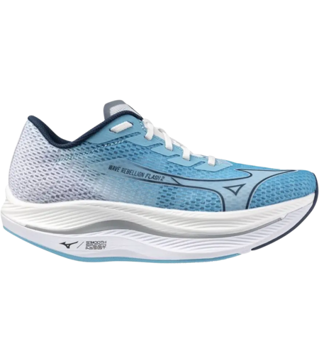 Mizuno WAVE REBELLION FLASH 2 - Eine neue Generation der Geschwindigkeit für erfahrene Läufer Der Wave Rebellion Flash 2 ist perfekt für Läufer, die schnelle Sprints in ihre Läufe integrieren möchten, egal ob sie für Wettkämpfe trainieren oder persönliche Bestzeiten setzen wollen. Dieser Schuh ist vollgepackt mit Funktionen, die das schnelle Laufen unterstützen, einschließlich des SMOOTH SPEED ASSIST. Das MIZUNO ENERZY LITE+ Material in der oberen Zwischensohle bietet verbesserte Weichheit bei geringem Gewicht, während das MIZUNO ENERZY FOAM in der unteren Zwischensohle Dämpfung und Energierückgabe gewährleistet. Erlebe einen komfortablen „Speed Day“ mit diesem Schuh, der dir hilft, in deinem eigenen gleichmäßigen Rhythmus zu laufen, geschmeidig und mit deiner bevorzugten Geschwindigkeit, ohne dabei auf Komfort zu verzichten. Technische Details des Mizuno WAVE REBELLION FLASH 2: SMOOTH SPEED ASSIST: Unterstützt Läufer dabei, die von Mizuno als ideal erachtete Laufbewegung zu nutzen. MIZUNO ENERZY LITE+ (oben) & ENERZY (unten): Die Kombination dieser beiden Zwischensohlenmaterialien bietet ein weiches und reaktionsschnelles Laufgefühl, das schnelles Laufen unterstützt. MIZUNO WAVE: Verbessert die Stabilität beim schnellen Laufen, ohne auf Weichheit zu verzichten. Die Platte, die bis zum Vorfuß reicht, unterstützt ebenfalls die Effekte des SMOOTH SPEED ASSIST. Nachhaltigkeit: Futter des Obermaterials: Mehr als 90% recycelter Inhalt. Einlegesohle: Mehr als 90% recycelter Inhalt. Wave Plate: Hergestellt aus pflanzenbasiertem Rilsan®. Gewicht: 205g Sprengung: 0,5mm Farbe: River Blue / Blue Wing Teal / White ...
