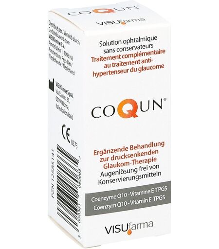 Anwendungsgebiet von Coqun AugentropfenCoqun Augentropfen ist eine sterile, konservierungsmittelfreie Augenlösung, die Coenzym Q10 und Vitamin E TPGS, zwei antioxidative Substanzen, enthält.Wirkungsweise von Coqun AugentropfenCoqun Augentropfen ist als ergänzende Behandlung zu einer drucksenkenden Glaukom-Therapie anwendbar (zur Senkung eines zu hohen Augeninnendrucks).Es kann der mit diesem Krankheitsbild einhergehenden oxidativen Schädigung entgegenwirken.Wirkstoffe / Inhaltsstoffe / ZutatenCoqun Augentropfen enthält:100 ml Coqun Augentropfen Augenlösung enthalten: 100 mg Coenzym Q10 500 mg Vitamin E TPGS (D-α-Tocopheryl- polyethylenglykol-1000-Succinat) Gepufferte isotonische Lösung auf 100 ml. GegenanzeigenBei bekannter Überempfindlichkeit gegenüber einem der oben genannten Inhaltsstoffe sollte das Produkt nicht angewendet werden.Sollten Sie unerwünschte Wirkungen beobachten, setzen Sie die Verwendung aus und kontaktieren Sie Ihren AugenarztDosierungAnwendungsempfehlung von Coqun Augentropfen:1-2 Tropfen 2-mal täglich in den Bindehautsack jedes Auges träufeln oder gemäß Anweisungen Ihres Augenarztes.Hinweise Das Produkt kann auch verwendet werden, wenn Sie Kontaktlinsen tragen. Verwenden Sie das Produkt mindestens 10 Minuten vor oder nach der Verwendung anderer Medikamente, die den Augeninnendruck senken. Das Produkt ist bis zu 60 Tage nach dem ersten Öffnen steril. Das Verfallsdatum bezieht sich auf das Produkt in ungeöffnetem, ordnungsgemäß gelagertem Zustand. Das Produkt darf nicht nach dem auf der Verpackung angegebenen Verfallsdatum verwendet werden. Bitte waschen Sie sich vor der Verwendung die Hände. Die Spitze der Flasche darf nicht Ihre Augen berühren. Die Flasche darf nicht verwendet werden, wenn sie beschädigt ist. Das Produkt von Licht- und Wärmequellen fernhalten und für Kinder unzugänglich aufbewahren. Zur Anwendung am Auge. Nicht schlucken. Coq ...
