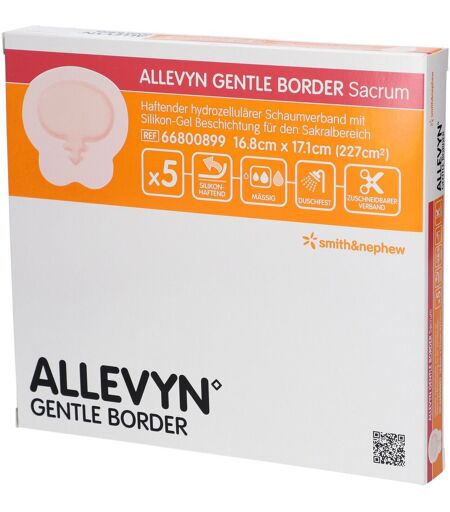 ALLEVYN GENTLE BORDER SACRUMSanft haftender Wundverband aus Polyurethanschaum für die Versorgung von Wunden mit mäßiger bis starker Exsudation. Anatomisch geformt für Wunden im Sakralbereich. Hält ohne Sekundärfixierung – steril.Flächige Silikon-Gel Beschichtung für sanften, sicheren HaltKann präzise am schwierigen Sakralbereich angebracht werdenIdeal zur DekubitusversorgungHohe Absorptionsfähigkeit und schnelle ExsudataufnahmeMinimiertes Risiko von HautmazerationenBakterien- und wasserdichter, atmungsaktiver TopfilmVerbandliegezeit bis zu 5 Tage ...