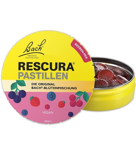 Anwendungsgebiet von Bachblüten Original Rescura Pastillen Beeren-MixBachblüten Original Rescura Pastillen Beeren-Mix sind wohltuende Lutschbonbons mit Süßungsmitteln – ideal für unterwegs oder in Momenten innerer Unruhe.Die BACH® RESCURA® Pastillen im fruchtigen Beeren-Mix vereinen fünf Original Bach®-Blüten in einer zuckerfreien, alkoholfreien und veganen Rezeptur – ideal für stressige Situationen im Alltag, auf Reisen oder vor wichtigen Terminen.Die Pastillen sind handlich, leicht anzuwenden und kommen ganz ohne Nebenwirkungen aus. Die Original Bach®-Blütenmischung wird seit über 90 Jahren nach traditioneller Methode aus Edward Bachs Garten in England gewonnen – für ein natürliches Gefühl von innerer Balance.Mit der bewährten Original Bach®-BlütenmischungZuckerfrei, alkoholfrei und veganReisefreundliches Format und perfekt für unterwegsNatürlich, ohne bekannte NebenwirkungenFür Erwachsene und Kinder geeignetWirkstoffe / Inhaltsstoffe / ZutatenZutaten von Bachblüten Original Rescura Pastillen Beeren-Mix:Geliermittel (Gummi arabicum), Süßungsmittel (Sorbit, Maltit, Steviolglycoside aus Stevia), Wasser, Beerenpulver (2,5%) (Maltodextrin, Konzentrate aus Schwarze Johannisbeere, Erdbeere, Heidelbeere, Cranberry), Säureregulator (Citronensäure), natürliches Holunderblütenaroma, Kokosöl, Überzugsmittel (Carbaubawachs), wässrige Verdünnung pflanzlicher Essenzen (Helianthemum nummularium, Clematis vitalba, Impatiens glandulifera, Prunus cerasifera, Ornithogalum umbellatum).Für eine vegane Ernährung geeignet.Unter 25°C und trocken lagern.Durchschnittliche Nährwerte pro 100g: Brennwert718 kJ170 kcalFett< 0,5 g - davon gesättigte Fettsäuren< 0,5 gKohlenhydrate29 g - davon Zucker0,7 gEiweiß1 gSalz1 gGegenanzeigenBei bekannter Überempfindlichkeit gegenüber einem der oben genannten Inhaltsstoffe sollte das Produkt nicht verwendet werden.DosierungVerzehrempfehlung von Bachblüten Original Rescura Pastillen ...