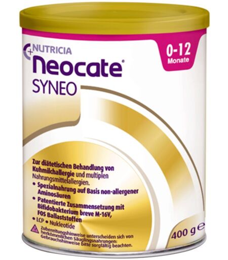 Spezialnahrung bei Kuhmilcheiweißallergie, für Säuglinge von Geburt an einsetzbar100% kuhmilcheiweißfrei, basierend auf nonallergenen Aminosäuren für einen schnellen & vollständigen Rückgang der SymptomeNeocate® SYNEO - die einzige 100 % kuhmilcheiweißfreie Spezialnahrung mit der patentierten Zusammensetzung aus Bifidobakterium breve M-16V und Fructooligosacchariden.Neocate SYNEO ist eine Spezialnahrung für Babys von Geburt an mit Kuhmilcheiweißallergie und multiplen Nahrungsmittelallergien, damit Ihr Kind auch ohne Kuhmilcheiweiß optimal mit wichtigen Nährstoffen versorgt wird und ganz normal wachsen kann.Seit über 30 Jahren wird Neocate zum Diätmanagement bei Kuhmilcheiweißallergie eingesetzt. Doch was macht Neocate SYNEO so besonders? Maximale Sicherheit und schnelle ErgebnisseNeocate® SYNEO wird vom Kinderarzt bei Verdacht auf Kuhmilcheiweißallergie zur Diagnose und Therapie eingesetzt. Denn Neocate® SYNEO ist kuhmilcheiweißfrei und schützt Kinder aufgrund der damit sicheren Zusammensetzung zuverlässig vor allergischen Beschwerden. Um weitere mögliche allergische Reaktionen bei multiplen Nahrungsmittelallergien zu vermeiden, stellen wir Neocate® SYNEO zudem ohne Hühner-, Soja- und Weizeneiweiß sowie Milchzucker (Laktose) her.Unkompliziert wie herkömmliche SäuglingsnahrungIm Rahmen der milchfreien Ernährung können Sie Ihrem Kind Neocate® SYNEO wie eine herkömmliche Säuglingsnahrung von Geburt an geben. Wenn Sie ab dem 5. Lebensmonat die Beikost einführen, kann Neocate® SYNEO ergänzend, z. B. als Getränk oder mit Getreide als Milchbrei, verwendet werden. Immer wenn Milch für die Zubereitung einer Babymahlzeit benötigt wird, nehmen Sie einfach Neocate® SYNEO als Ersatz. IndikationenNeocate® SYNEO ist besonders geeignet für Säuglinge zum Diätmanagement bei Kuhmilcheiweißallergie und multiplen NahrungsmittelallergienKuhmilcheiweißallergie bei KindernKuhmilch ist für die Entwicklung von nicht gestillten Babys in Form von Säuglingsnahrung von zentraler Bedeutung und liefert wichtige Nährstoffe für Wachstum und Gedeihen.Treten jedoch mit der Gabe von Milch allergische Reaktionen beim Kind auf, sind betroffene Eltern oft ratlos. Leichte vorübergehende Beschwerden wie Blähungen, Durchfall oder Hautreaktionen sind in der Regel harmlos und kommen häufiger vor in der kindlichen Entwicklung. Leidet Ihr Kind jedoch dauerhaft an vielfältigen und unspezifischen Beschwerden, kann manchmal auch eine Unverträglichkeit oder Nahrungsmittelallergie die Ursache sein.Wird bei Ihrem Kind eine Milchallergie – auch Kuhmilch- oder Kuhmilcheiweißallergie genannt – festgestellt, so ist eine milchfreie Ernährung (bei nicht gestillten Säuglingen) notwendig. Ihr Kind benötigt nun eine vollwertige und zugleich gut verträgliche Spezialnahrung als Ersatz für die Milch/Säuglingsmilch. Nur so wird es auch weiterhin mit allen essenziellen Nährstoffen versorgt, die für seine normale und gesunde Entwicklung wichtig sind.Unter einer strikt milchfreien Ernährung verschwinden die... ...