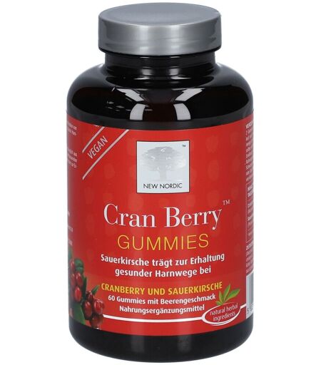 Nahrungsergänzungsmittel sind kein Ersatz für eine ausgewogene, abwechslungsreiche Ernährung und eine gesunde Lebensweise.Cran Berry™ Gummies Kombination aus Cranberry- und Sauerkirsch-Extrakten Sauerkirsche trägt zu gesunden Harnwegen bei Leckere Gummis mit Beerengeschmack 100% natürliche Farbstoffe und Aromen 60 Gummis pro Flasche VeganLeckere Gummis mit BeerengeschmackCran Berry™ gummies für Harnwege enthalten eine spezielle Kombination von Extrakten aus Cranberry und Sauerkirsche. Sauerkirsche hilft, gesunde Harnwege zu erhalten.Zutaten:Zucker, Glukosesirup, Wasser, Cranberry-Extrakt (Vaccinium macrocarpon L.), Pektin, Sauerkirschextrakt (Prunus cerasus L.), Säureregulator (Zitronensäure, Natriumcitrat), natürlicher Geschmack (gemischte Beeren, Erdbeeren), Saftkonzentrat aus schwarzer Karotte.Nährwerte: Durchschnittliche Nährwerte: pro 2 Gummies NRV* Cranberry-extract (Vaccinium macrocarpon L.) 5:1 300 mg - Sauerkirsch-Extrakt (Prunus cerasus L.) 5:1 120 mg - Verzehrempfehlung:2 Gummies pro Tag nach einer Mahlzeit zerkauen. Hinweis:Die angegebene empfohlene tägliche Verzehrmenge darf nicht überschritten werden.Aufbewahrung: Kühl (6-25 °C) und lichtgeschützt lagern. Außerhalb der Reichweite von kleinen Kindern aufbewahren.Nettofüllmenge: 60 Gummies = 180 g Herstellerdaten: New Nordic Deutschland GmbH Dannenkamp 21A22869 Schenefeld, Deutschland ...
