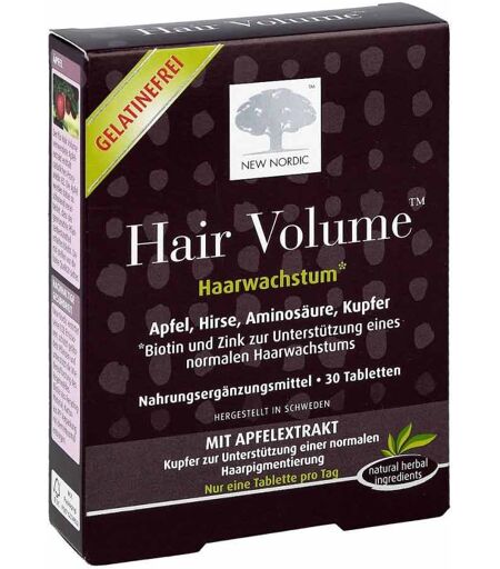 Wirkungsweise von Hair Volume TablettenDie Zusammensetzung der einzelnen Bestandteile der Volume Tabletten sind eine wertvolle Vitalstoffkombination. Apfel, Miliacin, Hirse und Kieselsäure liefern Nährstoffe für die Haarfolikel. Zink und Biotin sorgen für den Erhalt eines gesunden Haarwuchses. Der in den Hair Volume Tabletten enthaltene Apfelextrakt liefert wichtige pflanzliche Stoffe, die eine hohe Qualität des Produktes garantieren. Kupfer unterstützt die natürliche Pigmentierung der Haare. Bei der Herstellung wurde auf die Verwendung von Gelatine verzichtet.Wirkstoffe / Inhaltsstoffe / Zutaten1 Tablette von Hair Volume Tabletten enthält: Apfel-Extrakt 300mg Hirse-Extrakt 250mg Schachtelhalmkraut-Extrakt 200 entspricht Siliciumdioxid hydrat 14mg Cystein 60mg Methionin 50mg Biotin 0,475mg Calcium pantothenat, entspricht Pantothensäure 30mg Zinkoxid, entspricht Zink-Ion 10mg Kupfer(II)-sulfat, wasserfreies, Kupfer(II)-Ion 1mg Weitere Bestandteile: Carboxymethylstärke, Natrium Typ A Cellulose, mikrokristalline Siliciumdioxid Speisefettsäuren, Magnesiumsalze Hypromellose GegenanzeigenBei bekannter Überempfindlichkeit auf den Wirkstoff oder einen der sonstigen Bestandteile sollte das Medikament nicht angewendet werden. DosierungHair Volume Tabletten wird 1 x täglich nach dem Essen eingenommen.HinweiseDa es sich bei den Hair Volume Tabletten um ein Nahrungsergänzungsmittel handelt, sollten Sie sich an die empfohlene Dosierung halten. Die empfohlne Dauer der Anwendung ist über drei Monate. Somit können Sie die Hair Volume Tabletten als eine Art Kur über mehrere Wochen hinweg anwenden. Die Tabletten bieten jedoch keinen Ersatz für eine vollwertige und ausgewogene Ernährung. Bitte sprechen Sie eine Verlängerung der Anwendungsdauer daher unbedingt mit einem Arzt oder Apotheker ab. Hair Volume Tabletten können in Ihrer Versanda ...