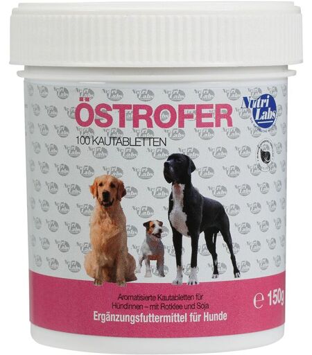 Nutrilabs Östrofer • Unterstützung des Hormonstoffwechsels • Speziell für Hündinnen formuliert • Mit Phytoöstrogenen aus Soja und Rotklee Östrofer ist ein Ergänzungsfuttermittel für Hündinnen mit Phytohormonen (pflanzliche Vorstufen für den Hormonstoffwechsel) aus Rotklee und Soja. Weiters enthält Östrofer einen Komplex aus Vitaminen und Mineralstoffen, welcher die generelle Hormonbalance und den Stoffwechsel von Hündinnen positiv unterstützen kann: Vitamin A, E, K3, D3, C, B1, B2, B6, B12 sowie Kupfer, Zink, Mangan und Selen. Oft ist die Ursache von Inkontinenz bei Hündinnen ein Abfall des Hormonspiegels, auch als Spätfolge einer Kastration. Insbesondere größere Hunderassen (>20 kg) können davon betroffen sein. Üblicherweise wird hier der Hündin eine Hormontherapie oder ein Arzneimittel (in der Regel auf Adrenalinbasis) verabreicht. Solche Therapien bekämpfen zwar das Problem, haben jedoch starke Nebenwirkungen auf den Organismus, das Herz und den Hormonspiegel des Tieres, insbesondere bei längeren Therapien. Östrofer unterstützt Hündinnen dabei, ihren Hormonhaushalt wieder auszugleichen, und das ohne einer dieser Nebenwirkungen. Das Produkt kann aber auch parallel zu Hormon- oder Adrenalin-Therapien eingesetzt werden, sodass hier verringerte Dosen von Arzneimitteln möglich sein könnten. Östrofer ist ein Produkt, welches auf Langzeitbasis verabreicht werden kann. Idealerweise wird direkt nach der Kastration mit dem Füttern begonnen. Es kann aber auch effektiv bei erst später auftretender Inkontinenz unterstützend gegeben werden. Fütterungsempfehlung:Pro Tag je nach Gewicht des Hundes.Gewicht (in kg)Menge (Kautabletten/Tag) 10,00,5 20,01,0 30,0 1,5 Zusammensetzung (pro kg)Milch- und Molkereierzeugnisse, Rotkleesaat 15 %, Sojabohnen getoastet 10 %, Fleisch und tierische Nebenerzeugnisse, Reis, Kartoffelstärke, pflanzliche Nebenerzeugnisse, Zucker, Eier- und Eiererzeugnisse, Hefen. Zusatzstoffe je kg: Vitamin A 187.500 IE Vitamin D3 18.750 IE Vitamin E (all rac-alpha-Tocopherylacetat) 5.925 mg Vitamin B1 (Thiaminmononitrat) 320 mg Vitamin B2 (Riboflavin) 830 mg Vitamin B6 ((Pyridoxinhydrochlorid) 665 mg Vitamin B12 (Cyanocobalamin) 5.220 mcg Vitamin K3 (als Menadion-Nicotinsäureamid-Bisulfit-Präparat) 540 mg Vitamin C (L-Ascorbinsäure) 8.250 mg Niacin 3.387 mg Kalzium-D-Pantothenat 2.025 mg Folsäure 125 mg Biotin 13.125 mcg Kupfer (als Glycin-Kupferchelat, Hydrat) 120 mg Mangan (als Glycin-Manganchelat, Hydrat) 900 mg Zink (als Glycin-Zinkchelat, Hydrat) 900 mg Selen (als Natriumselenit) ...
