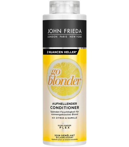 Die John Frieda Go Blonder Kollektion: Blond ist mehr als nur irgendeine Haarfarbe. Kaum eine andere Haarfarbe hat so viele Facetten und Nuancen und bietet so viele Möglichkeiten. Das neueste Ergebnis der John Frieda Forschungen ist die revolutionierte Formulierung der erfolgreichen Go Blonder Linie, welche mit der einzigartigen Go Blonder Plex Technologie angereichert wurde. So werden die Haare nicht nur aufgehellt, sondern es werden gleichzeitig geschädigte Haarfasern im Haar repariert, wodurch das Haar intensiv gepflegt ist und seine Leuchtkraft zurückbekommt. Mit GoBlonderPlex und Zitrusextrakt, Frei von Ammoniak und Peroxiden- versorgt Ihr Haar mit Feuchtigkeit und verleiht gemeinsam mit dem aufhellenden Shampoo neue, hellere Leuchtkraft. #GoBlonderGoStronger Resultat: heller, sonnengeküsst, natürlich aussehend Anwendung: Nach der Haarwäsche Conditioner sanft auf das nasse Haar auftragen. Gründlich ausspülen. Kann täglich verwendet werden. Warnhinweis: H412 - Schädlich für Wasserorganismen, mit langfristiger Wirkung. ...