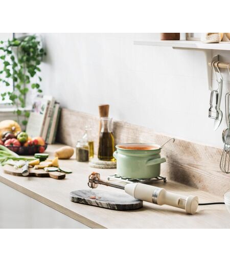 KitchenAid Stabmixer, creme Farbe: Creme Material: Kunststoff und Metall Maße: B x H x T ca. 9 x 41 x 6,4 cm Länge Kabel ca. 152,2 cm Inhalt: Inkl. Schneebesen, Topfschutz, Zerkleinerer, Mischerarm, Mixbehälter, Stromkabel und Bedienungsanleitung Gewicht: Ca. 935 g Leistung: 180 W Energieeffizienz-Angaben: Informationen zur Entsorgung sowie zu Sammelstellen in Ihrer Nähe finden Sie unter www.tchibo.de Technische Details: Motor: Wechselstrom Leistung: 180 W Spannung 220-240 V Frequenz: 50/60 Hz Anzahl der Geschwindigkeitsstufen: Variabel Umdrehungen pro Minute: Messer: 8.250-11.600 Zerkleinerermesser: 1.375-1.933 Schneebesen: 825-1.160 Sonstige Hinweise: Hersteller und Garantiegeber: KitchenAid Europa, Inc., Nijverheidslaan 3, box 5, 1853 Strombeek-Bever, Belgium Garantiedauer: 2 Jahre Garantieumfang: auf das Gerät Geltungsbereich: in allen Verkaufsländern Zum Zerkleinern, Pürieren und AufschlagenKabelgebundener Stabmixer, kompakt und leichtMit GeschwindigkeitsreglerAbnehmbarer Mischerarm mit 4-Klingen-EdelstahlmesserZerkleinererSchneebesenaufsatz1-l Mixerkrug mti Skala, Deckel und Griff, BPA-freiAbnehmbarer Topfschutz ...