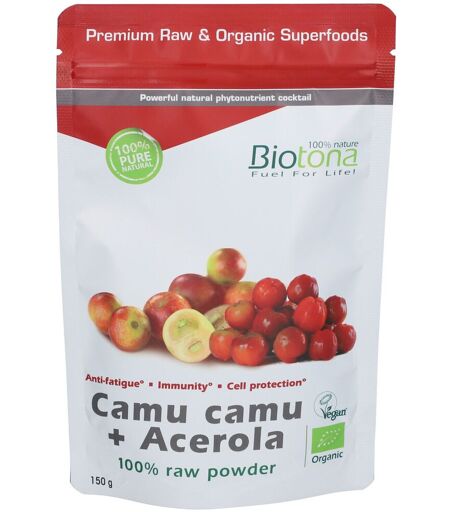 Eine abwechslungsreiche und ausgewogene Ernährung und ein gesunder Lebensstil sind wichtig.Nahrungsergänzungsmittel - Biotona bio Camu Camu + Acerola Raw ist eine Mischung aus gefriergetrocknetem Pulver von Acerola und Camu Camu. Die Acerola oder Westindische Kirsche ist wegen ihres hohen Gehalts an °Vitamin C und anderen Phytonährstoffen sehr beliebt. Camu Camu ist eine purpurrote Frucht, die an bis zu 5 m hohen buschigen Sträuchern wächst, die die sumpfigen Ufer des Amazonas in Südamerika bedecken. Studien haben gezeigt, dass Camu Camu bis zu 2 % Vitamin C enthalten kann, wobei dieser Gehalt je nach Reifegrad variiert. Biotona bio Camu Camu + Acerola Raw von stammt von brasilianischen Acerola und peruanischen Camu Camu, die zu 100% biologisch angebaut werden. Nach ihrer Ernte und einer sorgfältigen Auswahl werden sie sofort in einem Gefriertrocknungsprozess zu Pulver gemahlen. Sowohl der Geschmack als auch die Farbe und der Duft bleiben erhalten und sind fast gleichwertig mit denen der frischen Beeren. Bei diesem Trocknungsverfahren bleiben auch alle natürlich vorkommenden Nährstoffe erhalten. Zutaten Pro 10 g Tagesdosis: Camu Camu Pulver aus Peru (7,5 g)*, Acerola Pulver aus Brasilien (2,5 g)*, davon 500 mg Vitamin C (625 % der Referenzmenge). *aus kontrolliert biologischem Anbau(Myrciaria dubia, Malpighia glabra) Verzehrempfehlung Geben Sie täglich 5 bis 10 g (2 bis 4 Teelöffel) Biotona bio Camu camu + Acerola Raw in Ihre Smoothies und Shakes in Kombination mit Frucht(saft) oder anderen Superfoods, oder einfach in (Pflanzen-)Milch oder Joghurt Vorsichtsmaßnahmen für die Anwendung Außerhalb der Reichweite von kleinen Kindern aufbewahren. Die empfohlene Dosis darf nicht überschritten werden. Ein Nahrungsergänzungsmittel sollte kein Ersatz für eine abwechslungsreiche Ernährung und eine gesunde Lebensweise sein. Kühl, trocken und lichtgeschützt aufbewahren.Nettogewicht150 gAdresse des Herstellers BIOTONAKeyPharm LaboratoriesSiemenslaan 118020 Oostkamp, Belgien ...