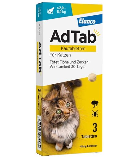 Anwendungsgebiet von AdTab Katze 2 - 8 kg Kautablette gegen Zecken und FlöheEin Parasitenbefall ist nicht nur lästig, sondern kann auch Auslöser für unterschiedliche Symptome wie Rötungen und Juckreiz oder für Krankheiten sein. Durch verschiedene Umweltfaktoren und klimatische Veränderungen haben Flöhe und auch Zecken mittlerweile fast ganzjährig Saison.AdTab™ Kautabletten für Katzen über 2 bis 8 kg Körpergewicht sind ein orales Zeckenmittel in praktischer Tablettenform und ohne Rezept erhältlich. Sie bieten einen effektiven Zecken- und Flohschutz für die Katze für einen ganzen Monat.Flöhe und Zecken werden innerhalb von wenigen Stunden nach der Gabe für die Dauer von einem Monat rasch abgetötet. Dies verhindert eine Eiablage durch Flöhe. Der Vermehrungszyklus von Flöhen wird dadurch gestoppt und eine Kontamination der Umgebung reduziert. AdTab™ Kautabletten sind bereits für Katzenwelpen ab der 8. Lebenswoche und über 2 kg Körpergewicht geeignet. Die Anwendung von AdTab™ ist besonders einfach: Die leckere Kautablette mit Vanille-Hefe-Aroma ist klein und wird von Katzen sehr gerne gefressen. Zur optimalen Wirkung von AdTab™ sollte die Tablette entweder direkt mit oder innerhalb von 30 Minuten nach der Fütterung gegeben werden. Alternativ kann AdTab™ auch unmittelbar nach der Mahlzeit - in Wurst oder Käse gewickelt - gefüttert werden.Wirkungsweise von AdTab Katze 2 - 8 kg Kautablette gegen Zecken und FlöheAdTab Katze 2 - 8 kg Kautablette gegen Zecken und Flöhe enthalten den Wirkstoff Lotilaner. Dieser wirkt gegen Flöhe (Ctenocephalides felis und C. canis) und Zecken (Ixodes ricinus) und für die Dauer von einem Monat. Der Wirkstoff wird aus dem Magen-Darm-Trakt der Katze aufgenommen und wirkt erst, nachdem die Parasiten sich an die Katze angeheftet und mit der Nahrungsaufnahme begonnen haben. Flöhe werden vor der Eiablage abgetötet und somit der Vermehrungszyklus unterbrochen und eine Kontamination der Umgebu ...