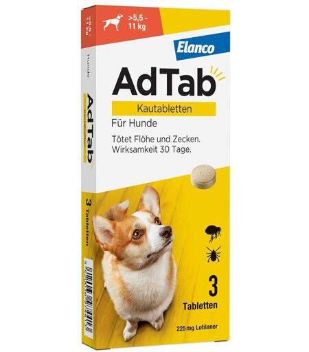 Anwendungsgebiet von AdTab Hund 5,5 - 11 kg Kautablette gegen Zecken und FlöheEin Parasitenbefall ist nicht nur lästig, sondern kann auch Auslöser für unterschiedliche Symptome wie Rötungen und Juckreiz oder für Krankheiten sein. Durch verschiedene Umweltfaktoren und klimatische Veränderungen haben Flöhe und auch Zecken mittlerweile fast ganzjährig Saison.AdTab™ Kautabletten für Hunde über 5,5 bis 11 kg Körpergewicht sind ein orales Zeckenmittel in praktischer Tablettenform und ohne Rezept erhältlich. Sie bieten einen effektiven Zecken- und Flohschutz für den Hund für einen ganzen Monat.Flöhe und Zecken werden innerhalb von wenigen Stunden nach der Gabe für die Dauer von einem Monat rasch abgetötet. Dies verhindert eine Eiablage durch Flöhe. Der Vermehrungszyklus von Flöhen wird dadurch gestoppt und eine Kontamination der Umgebung reduziert.AdTab™ Kautabletten sind bereits für Welpen ab der 8. Lebenswoche und mindestens 1,3 kg Körpergewicht geeignet. Um vom kleinen Terrier ab 1,3 kg bis zum großen Schäferhund bis 45 kg das passende Produkt zu haben, gibt es AdTab™ für den Hund in insgesamt 5 unterschiedlichen Gewichtsklassen. Für die sehr großen Hunderassen über 45 kg empfiehlt sich, nach genauer Gewichtsermittlung, eine Kombination der Kautabletten entsprechend dem Körpergewicht des Hundes. Die Anwendung von AdTab™ ist besonders einfach:Die leckere Kautablette mit Rindfleischgeschmack ist klein und wird vom Hund gerne gefressen. Zur optimalen Wirkung von AdTab™ sollte die Tablette entweder direkt mit oder innerhalb von 30 Minuten nach der Fütterung gegeben werden. Alternativ kann AdTab™ auch unmittelbar nach der Mahlzeit - in Wurst oder Käse gewickelt - gefüttert werden.Wirkungsweise von AdTab Hund 5,5 - 11 kg Kautablette gegen Zecken und FlöheAdTab Hund 5,5 - 11 kg Kautablette gegen Zecken und Flöhe enthalten den Wirkstoff Lotilaner. Dieser wirkt gegen Flöhe (Ctenocephalides felis und C. canis) und Zecken ( ...
