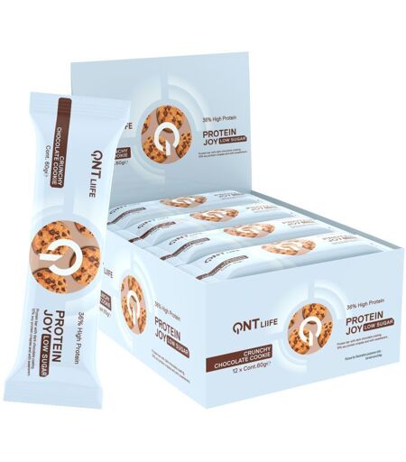 Bitte achten Sie auf eine ausgewogene, abwechslungsreiche Ernährung und eine gesunde Lebensweise.QNT Protein Joy Riegel Cookies & Cream Bis zu 38% hochwertiges Protein pro Riegel Sehr wenig Zucker: nur 2,2 g pro Riegel 3 leckere Geschmacksrichtungen in handlicher GrößeEntdecke die leckersten Proteinriegel. PROTEIN JOY ist ein echter Schokoladengenuss, der Ihre Geschmacksknospen erfreut und gleichzeitig sehr viel Protein liefert. Darüber hinaus ist einer seiner größten Vorteile die sehr geringe Zuckerkonzentration. Mit einer handlichen Größe, die es leicht macht, sie überall hin mitzunehmen, und seinen 3 absolut köstlichen Geschmacksrichtungen wird Sie PROTEIN JOY mit einem Bissen verführen.Zutaten:Dunkle Schokolade 30% (Süßstoff E965, Kakaomasse, Kakaobutter, Butterfett, Emulgator E442), Milchprotein, Sojaprotein, Feuchthaltemittel E422, Kollagenpeptide, Süßungsmittel E965/E955, Oligofruktose, Füllstoff E1200, Kakaobutter, Palmfett, Tapioka Stärke, Vollmilchpulver, Kakaopulver Emulgator E322 (enthält Soja), Aromen, Salz, Farbstoff E150a.Enthält Milch, Soja. Kann Spuren von Gluten, Ei, Erdnüssen und Nüssen enthalten.Nährwerte: Durchschnittliche Nährwerte: pro Riegel (60 g): pro 100 g: Energie 230 kcal 383 kcal Fett - davon gesättigte Fettsäuren 9 g 5,3 g 15 g 8,8 g Kohlenhydrate - davon Zucker 21,6 g 2,2 g 36 g 3,6 g Eiweiß 22,8 g 38 g Salz 0,36 g 0,60 g Verzehrempfehlung: Keine besonderen Verzehrhinweise.Hinweis: Die angegebene empfohlene Tagesmenge darf nicht überschritten werden.Aufbewahrung:Kühl (6-25 °C) und lichtgeschützt lagern. Außerhalb der Reichweite von kleinen Kindern aufbewahren.Nettofüllmenge: 60 gHersteller:QNT SA, Technoparc de Thudinie 6536 - Donstiennes BELGIEN ...